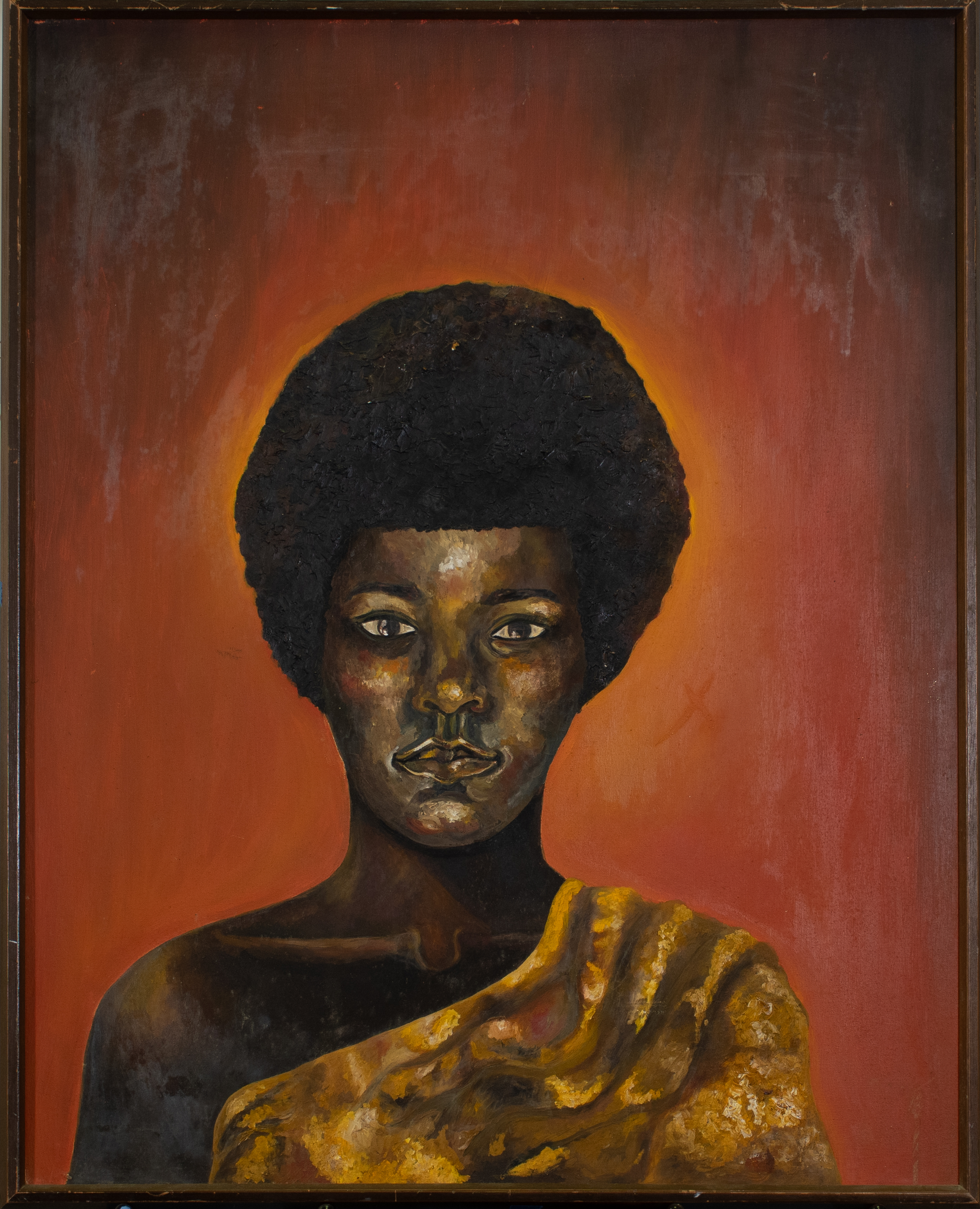 Tinker's painting is a self-portrait of the artist wearing her hair in an afro and a tunic draped over one shoulder. A golden halo emanates from behind her afro, attracting the viewer's eye to the center. As a part of the art curriculum, students would create various self-portraits. Tinker continues to practice art and is now based in Boston.