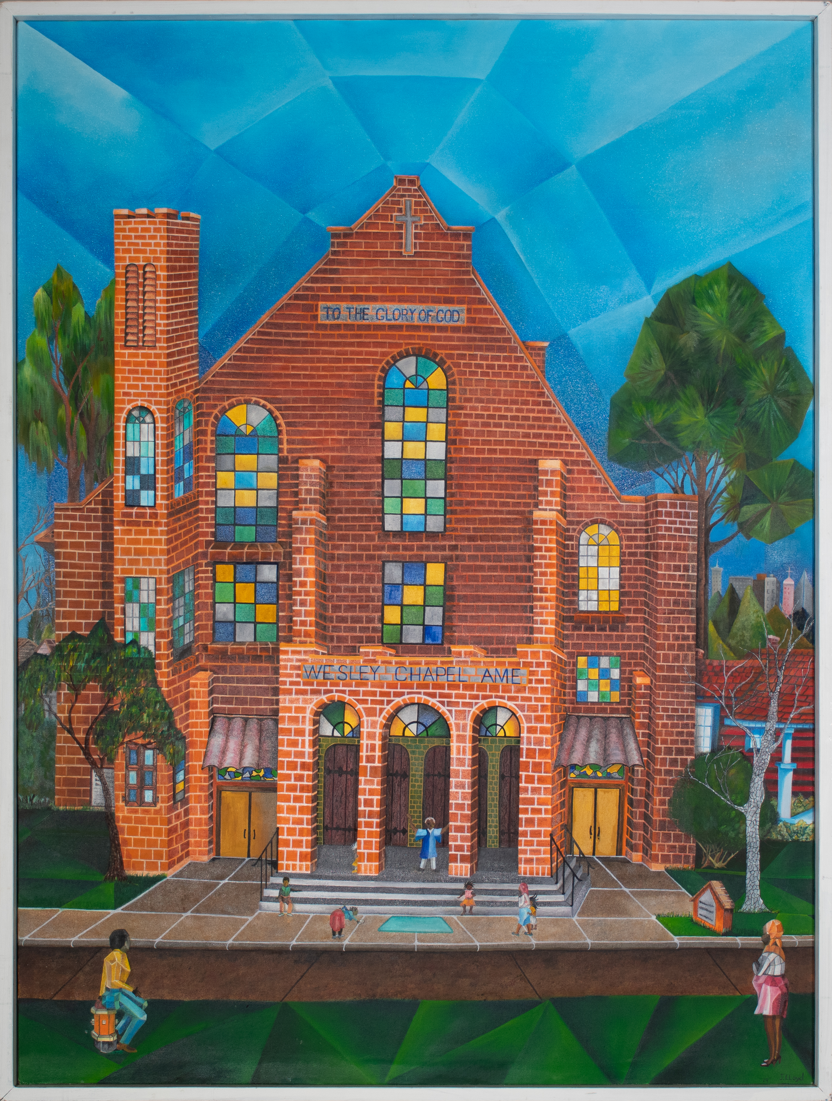 Lloyd’s painting depicts the facade of the historic Wesley Chapel AME Church, founded in Houston’s Third Ward in the 1870s. The landscape and sky are painted in geometric form, commonly found in 1970s TSU student artwork. The church is set to be renovated and turned into a multi-purpose complex with a gospel music museum, recording studio, and affordable housing units.