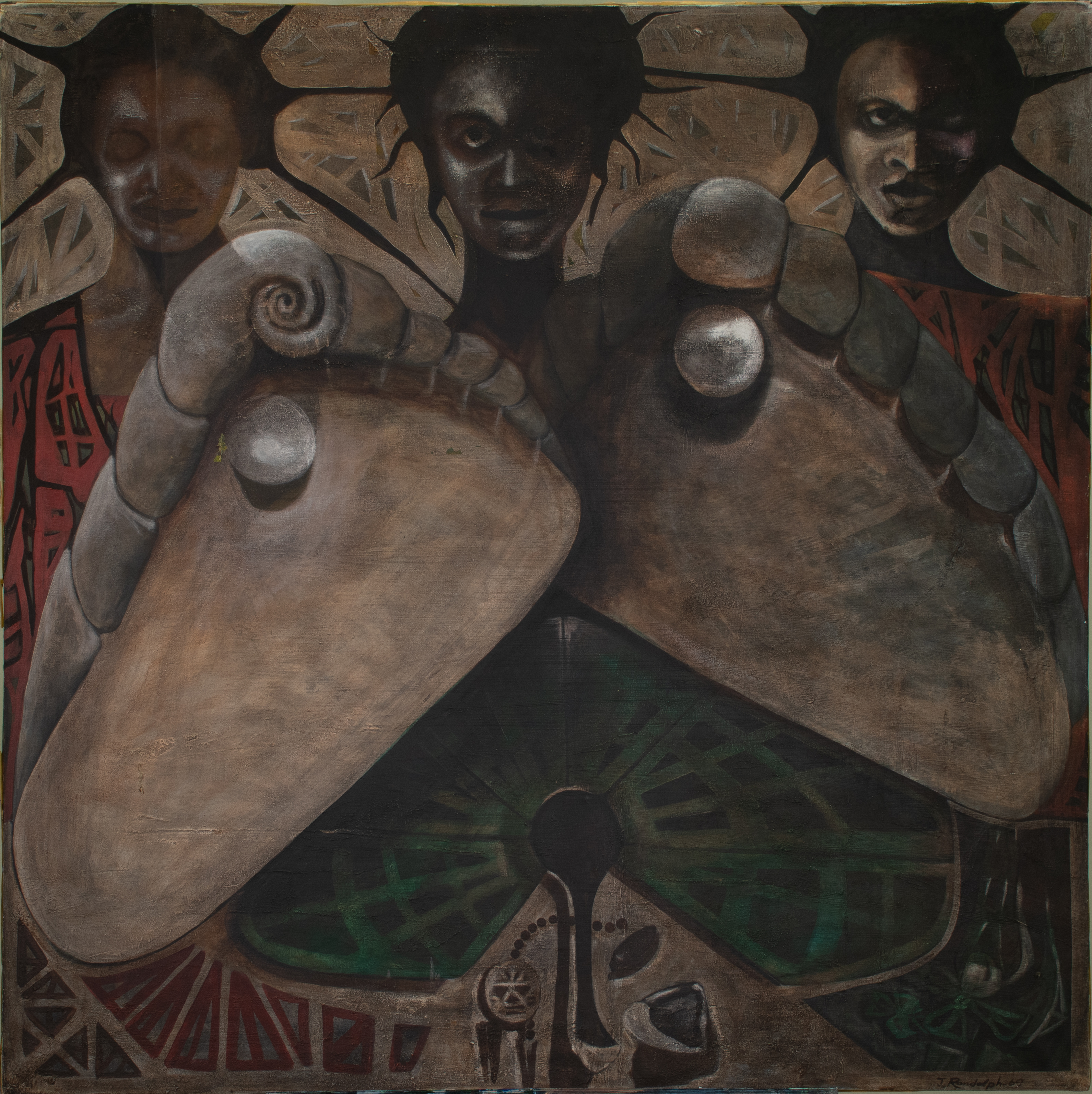 Randolph’s painting shows giant pearls, embedded in oversized shells, in front of a group of three Black women. The pearls reference the beauty of the women, whose hair extends out from their heads to form a unifying pattern between them. Towards the bottom, a leaf fan implies regalness, while the small mask indicates African heritage.