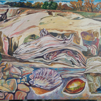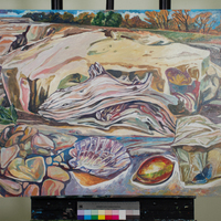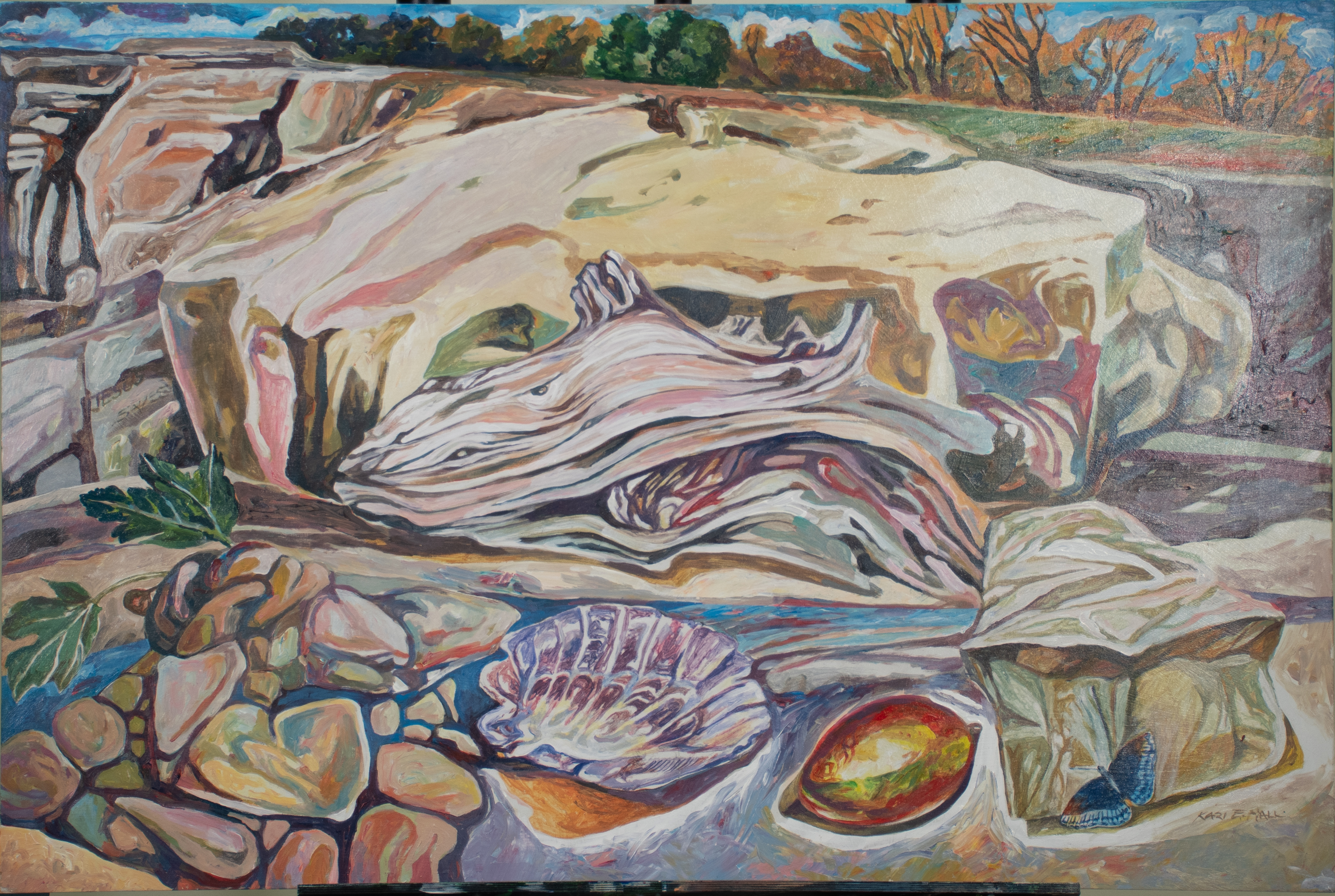 Hall’s painting is a surreal landscape of water flowing through a creek with various items along the path. There is also a faint inscription that reads “Jesus Saves” on a boulder to the far left. A mango, fossil, and butterfly are all pictured in the foreground. The loose and fluid paint strokes are reminiscent of impressionist paintings and characteristic of Hall’s style, particularly his more recent works.