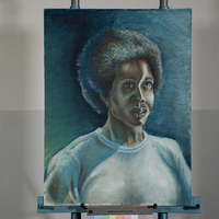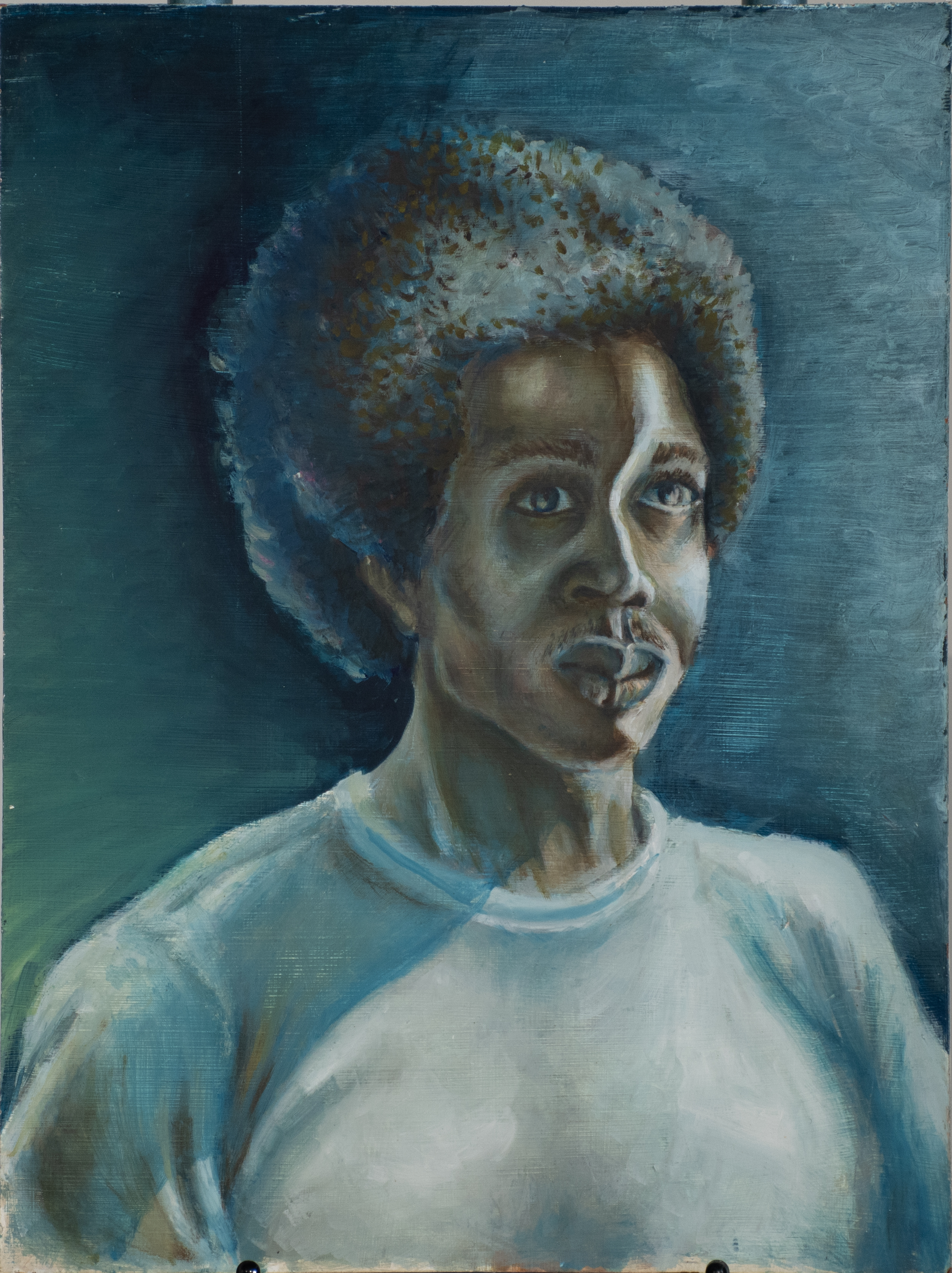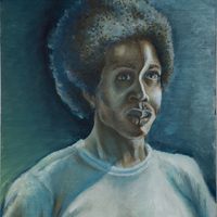 Samples’ painting is a self-portrait. During the elementary painting course, Texas Southern art majors are required to paint self-portraits. Samples’ classmates recall being intimidated and inspired by his talent and work pace when they sat next to him in the studio. Samples was one of the founders of Houston’s Project Row Houses and now works as an art conservator at the Museum of Fine Arts, Houston.