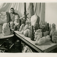 This photograph shows a young Carroll Harris Simms, with many of his sculptures, as an art student at Cranbrook Academy of Art. Simms received his BFA and MFA from Cranbrook, where he was the first African American graduate. Simms recalled the way student and faculty advocates helped him integrate the school. In 1950, Simms came to Texas Southern to help Dr. John T. Biggers run the art department; Simms taught pottery, sculpture, ceramics, and jewelry making classes.
