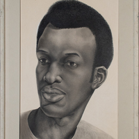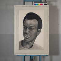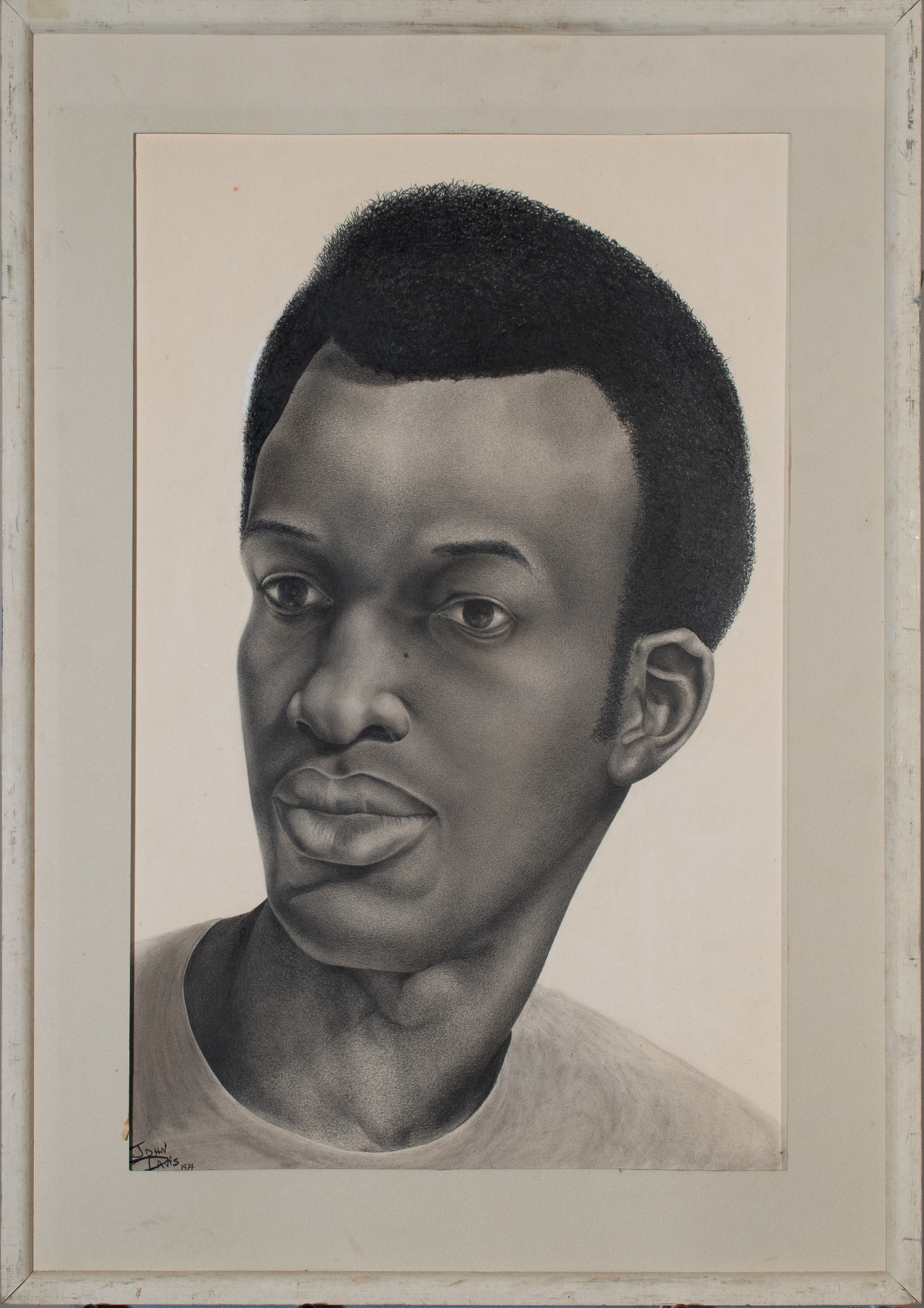 Davis drew his black-and-white self portrait during his time as an art student at Texas Southern University. He drew himself clean-shaven with long sideburns. His use of charcoal creates the smooth and balanced shading seen in this piece.The artist also completed a terracotta self portrait of his head. Self-portraits in drawing classes remain a part of the art major curriculum at TSU.
