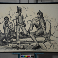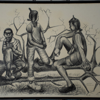 Tinker’s drawing shows three children lounging around a fallen tree. The two girls are depicted with elongated limbs, and the rightmost girl also has oversized hands. Dr. Biggers influenced his students to draw the hands and feet of their subjects in great detail and disproportionately large. This style continues to be taught to and implemented in the works of TSU artists in the 21st century.