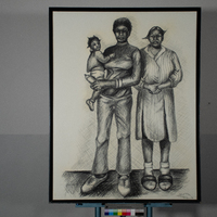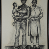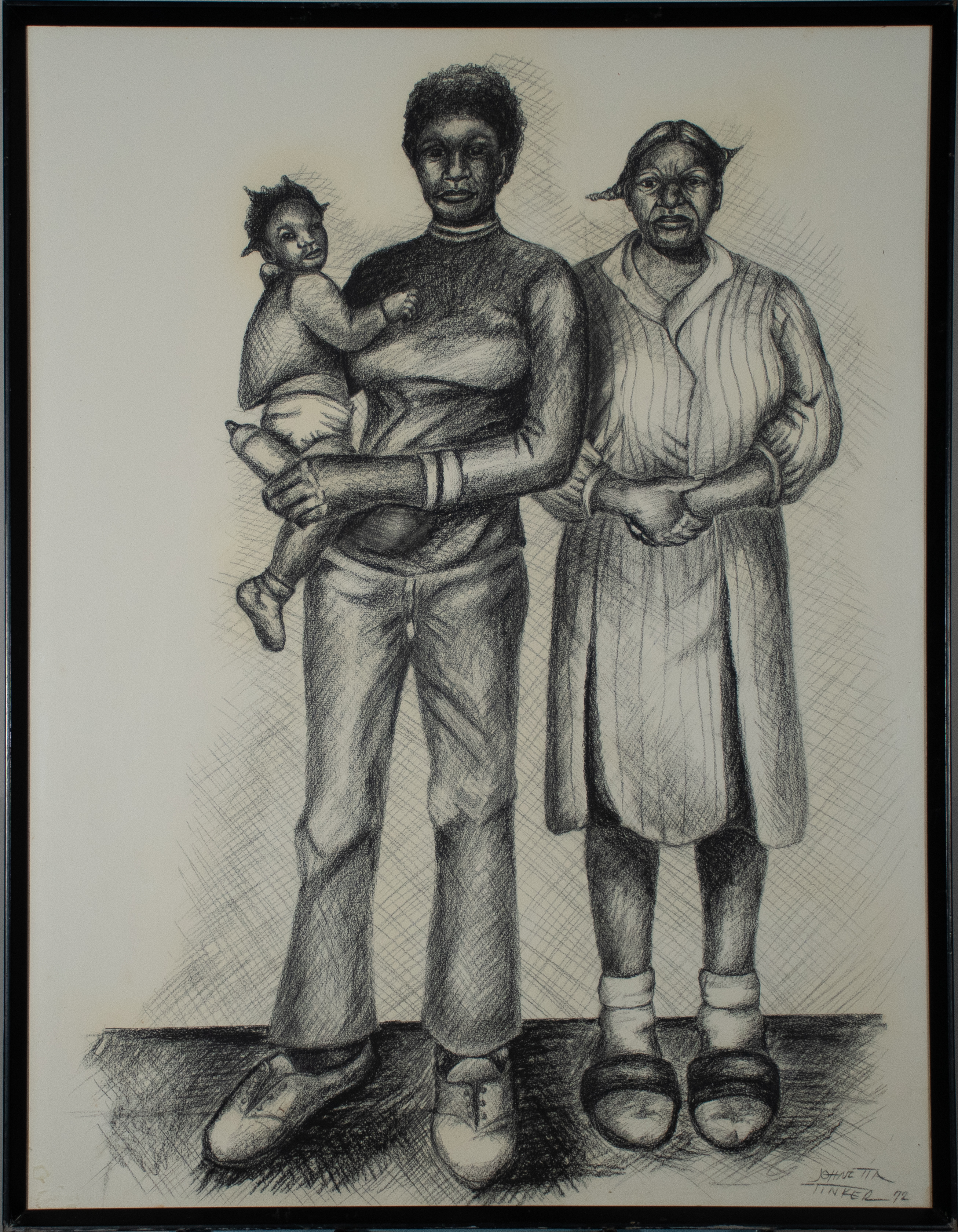Tinker's drawing appears to portray three generations of women, with a baby, her mother, and her grandmother. The mother holds her daughter and her bottle; the grandmother stands behind them with her hands crossed. Dr. Biggers’ artwork often centered women and their contributions to the family and society. He passed these themes along to his students, who, like Tinker, frequently highlight the relationship between mother and child.