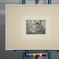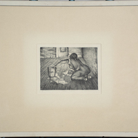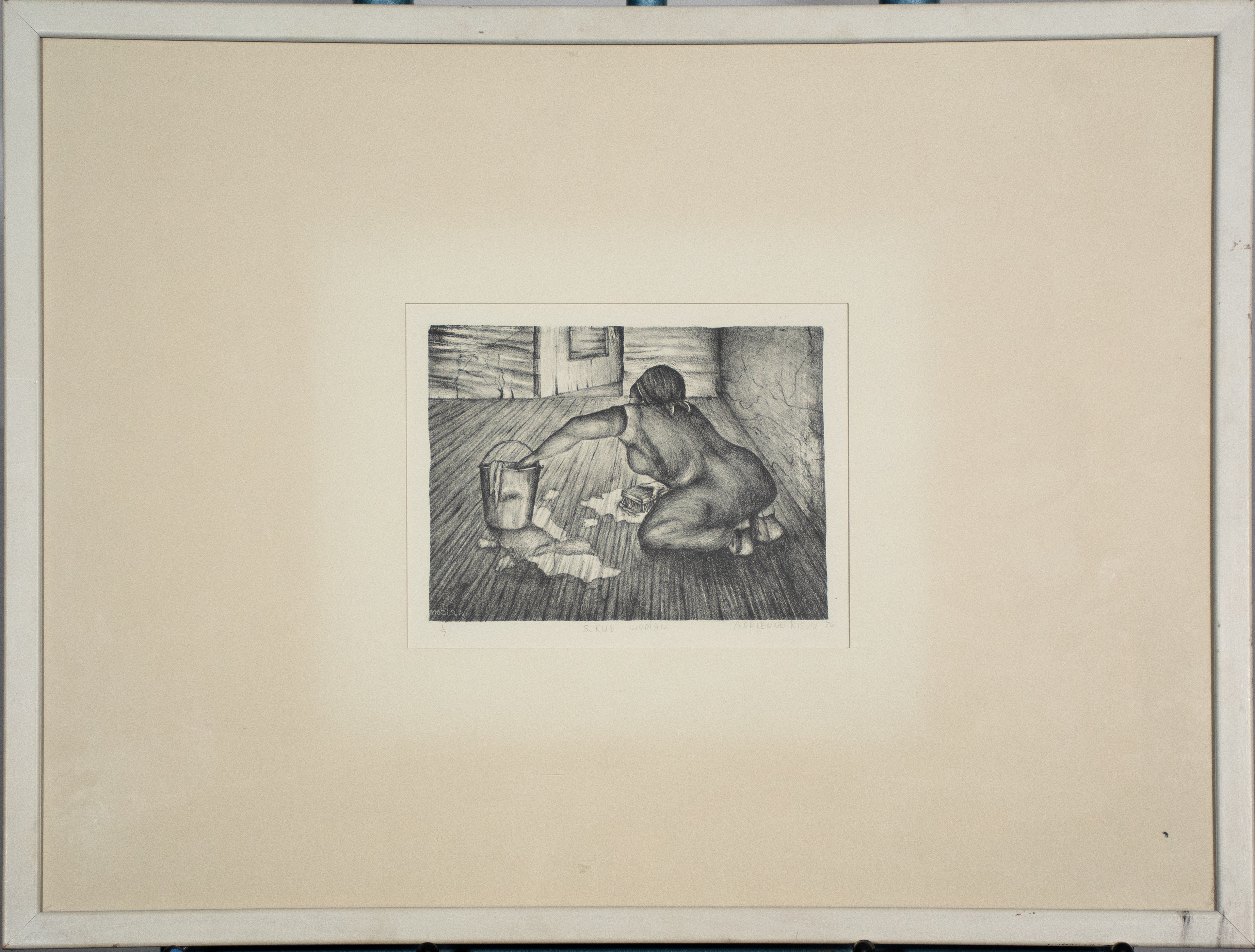 Rison-Isom’s print depicts a woman kneeling to clean wooden floors with a scrubber and bucket. The room appears worn and cracked, indicating age and heavy use. This work highlights the importance of Black women’s labor, which has too often been neglected. In the 19th and 20th centuries, huge numbers of Black women worked as domestic laborers.