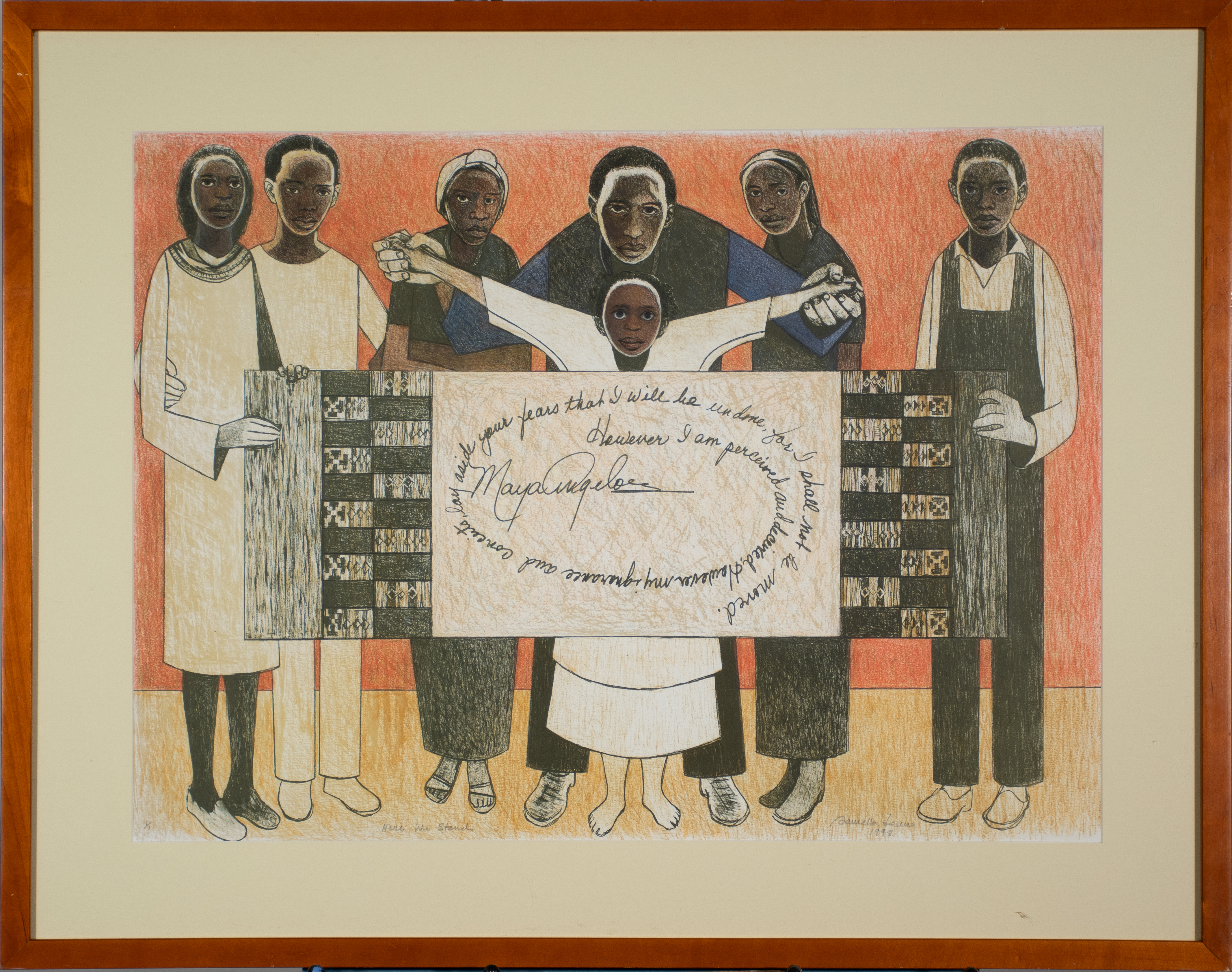 Lewis’s print shows a group of people holding a Kente-style textile, inscribed with the words, “However I am perceived and deceived, however my ignorance and conceits, lay aside your fears that I will be undone, for I shall not be moved," a selection from Maya Angelou’s poem Our Grandmothers; John Biggers also created illustrations to accompany Angelou's poem. Lewis was a leading African-American artist and art historian. She and Biggers studied together at Hampton University.
