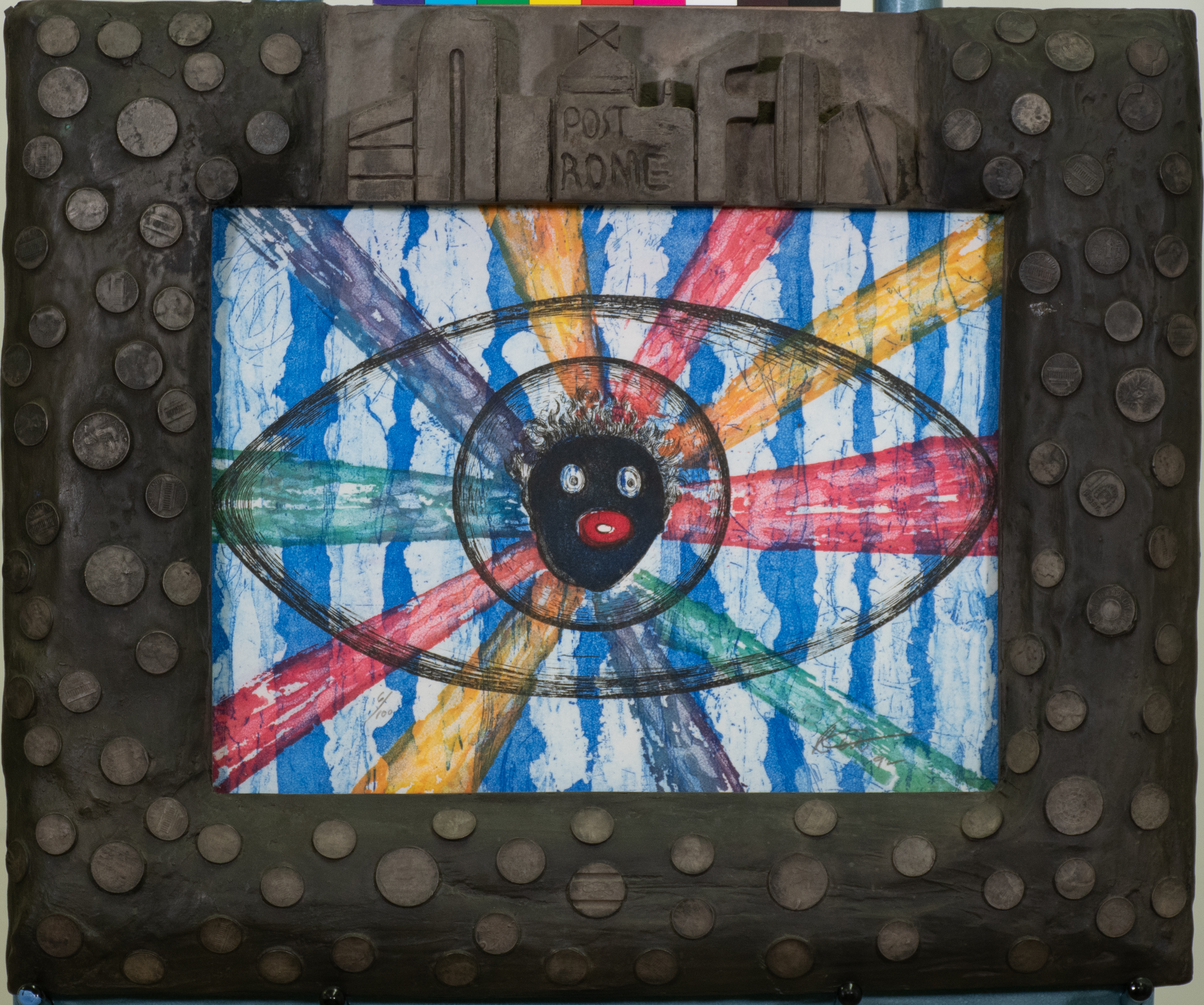 Long’s print was created during his 1990 Prix de Rome fellowship. At the center of the design is a large, oval-shaped eye. This is a frequently used motif in Long’s artwork, across many different mediums. The vertical and diagonal rays and bars draw attention towards the eye, which features a man’s face where the pupil would be. The frame, made from cast bronze, features a city skyline, embedded coin shapes, and the words “Post Rome.”