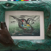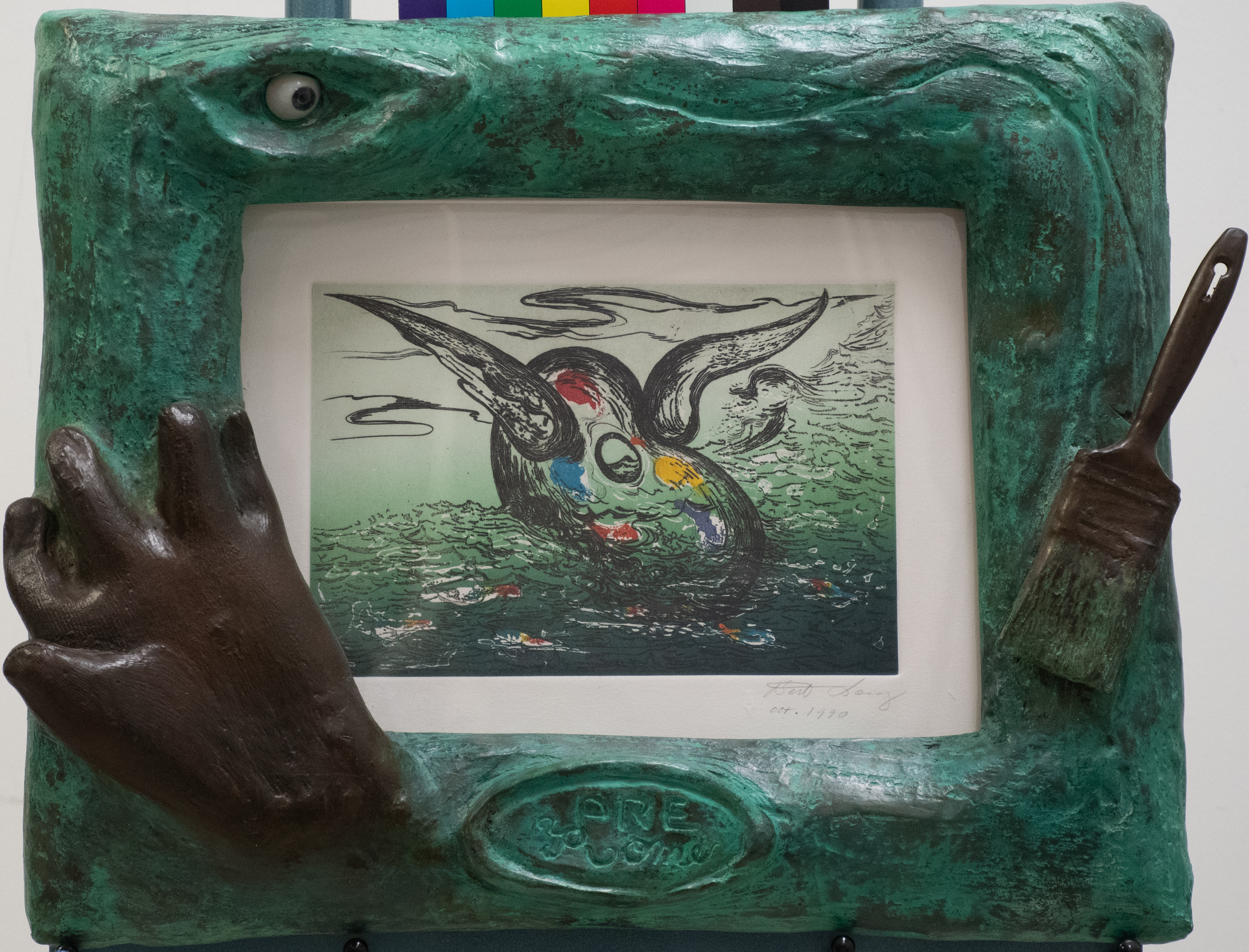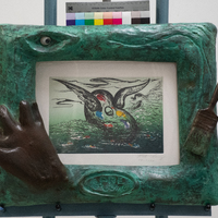 Long’s print was created during his 1990 Prix de Rome fellowship. The print features two aquatic animals, possibly whales or birds, emerging from the water, while other colorful creatures float around and within them. The cast bronze frame features the words “Pre Rome,” a hand, a paintbrush, and an eyeball, which is one of the motifs that appears most frequently in Long’s artwork.