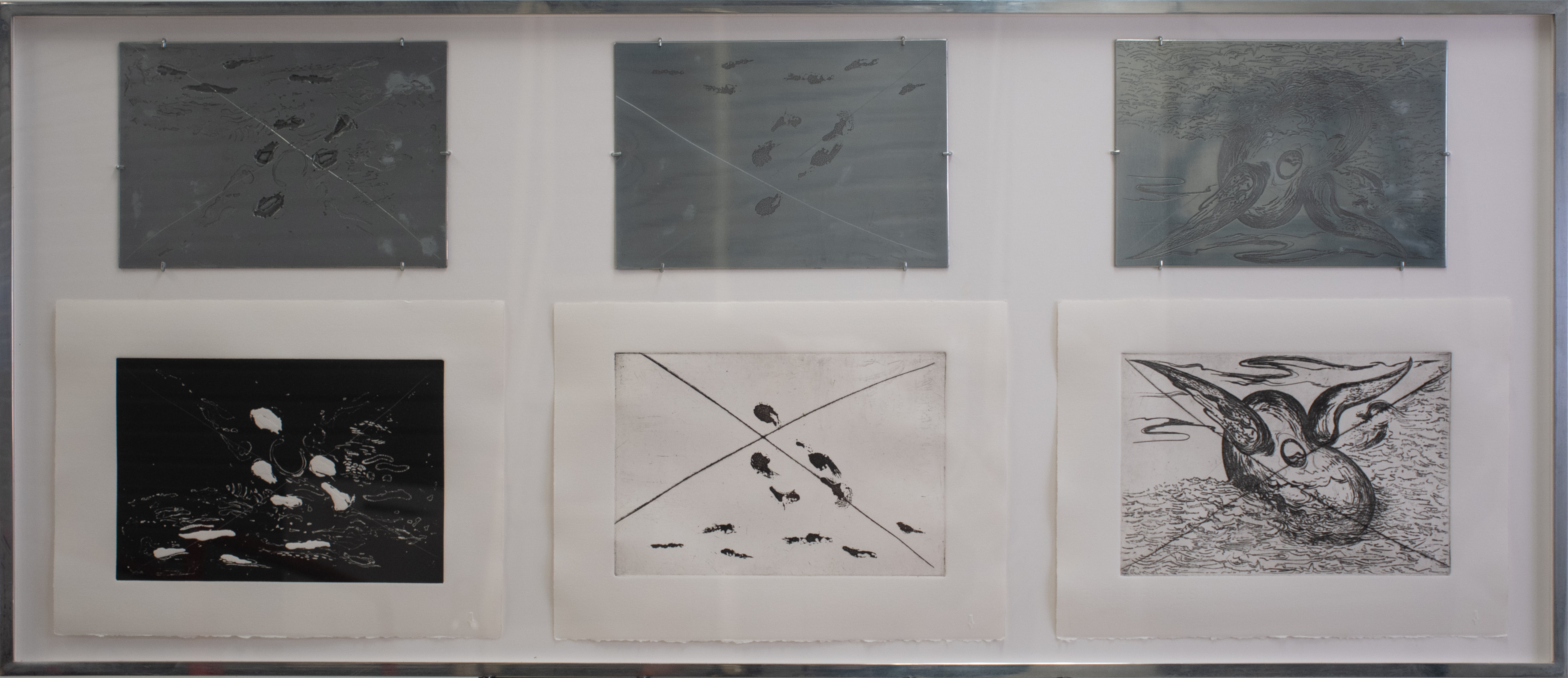 This piece features a set of three etching plates and samples. Together, these three plates form the design for Long’s 1990 print Pre Rome. This piece was created during Long’s Prix de Rome fellowship. Long rose to prominence as an “outsider artist” without formal training, later becoming one of the co-founders of Project Row Houses.