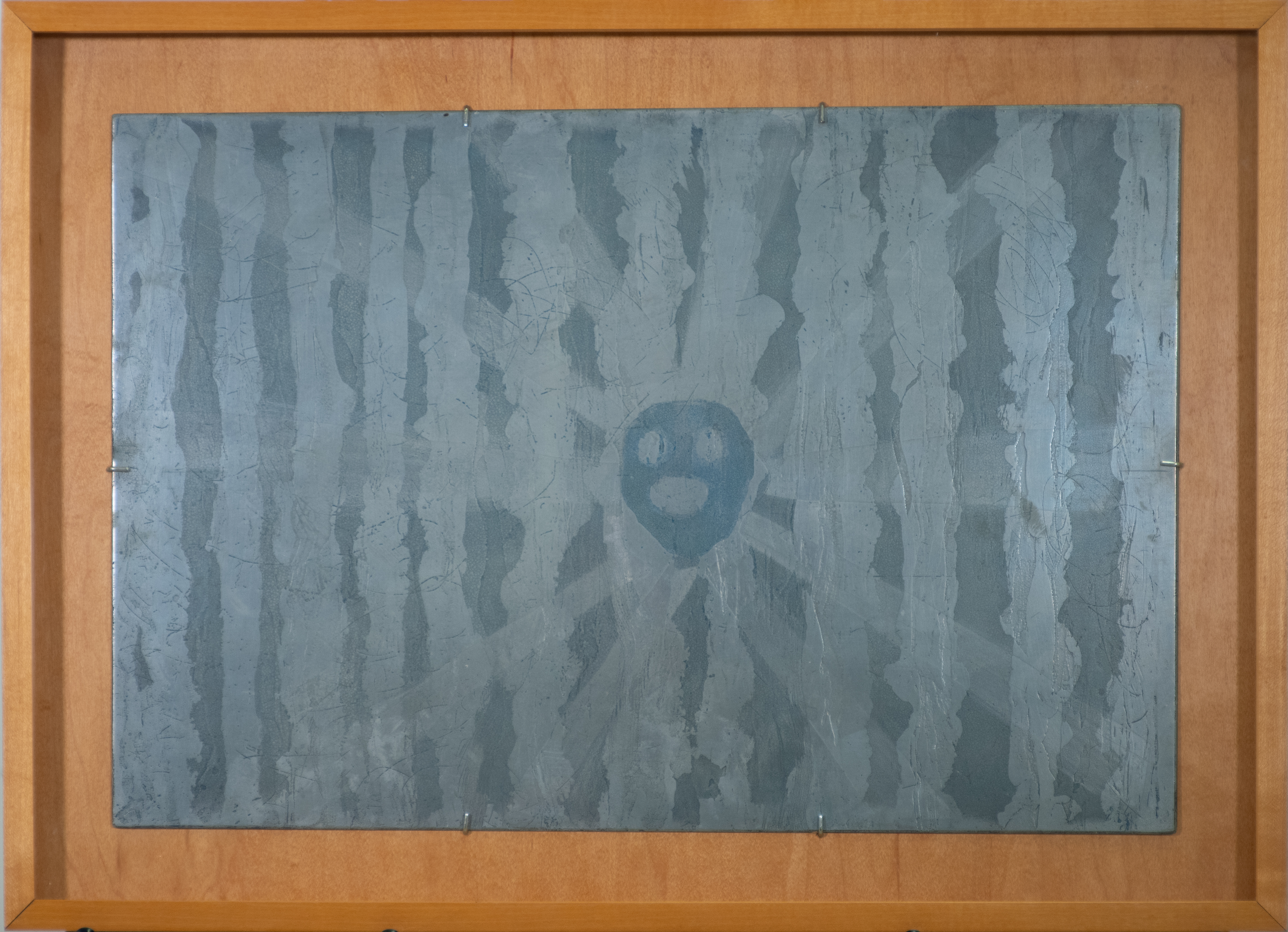 This is a zinc etching plate for one layer of Long’s Post Rome, a man’s face with vertical bars and diagonal rays around it. In the full print, the center of the design is a large, oval-shaped eye. This is a frequently used motif in Long’s artwork, across many different mediums. The vertical and diagonal rays and bars draw attention towards the eye, which features a man’s face where the pupil would be. Long’s print was created during his 1990 Prix de Rome fellowship.