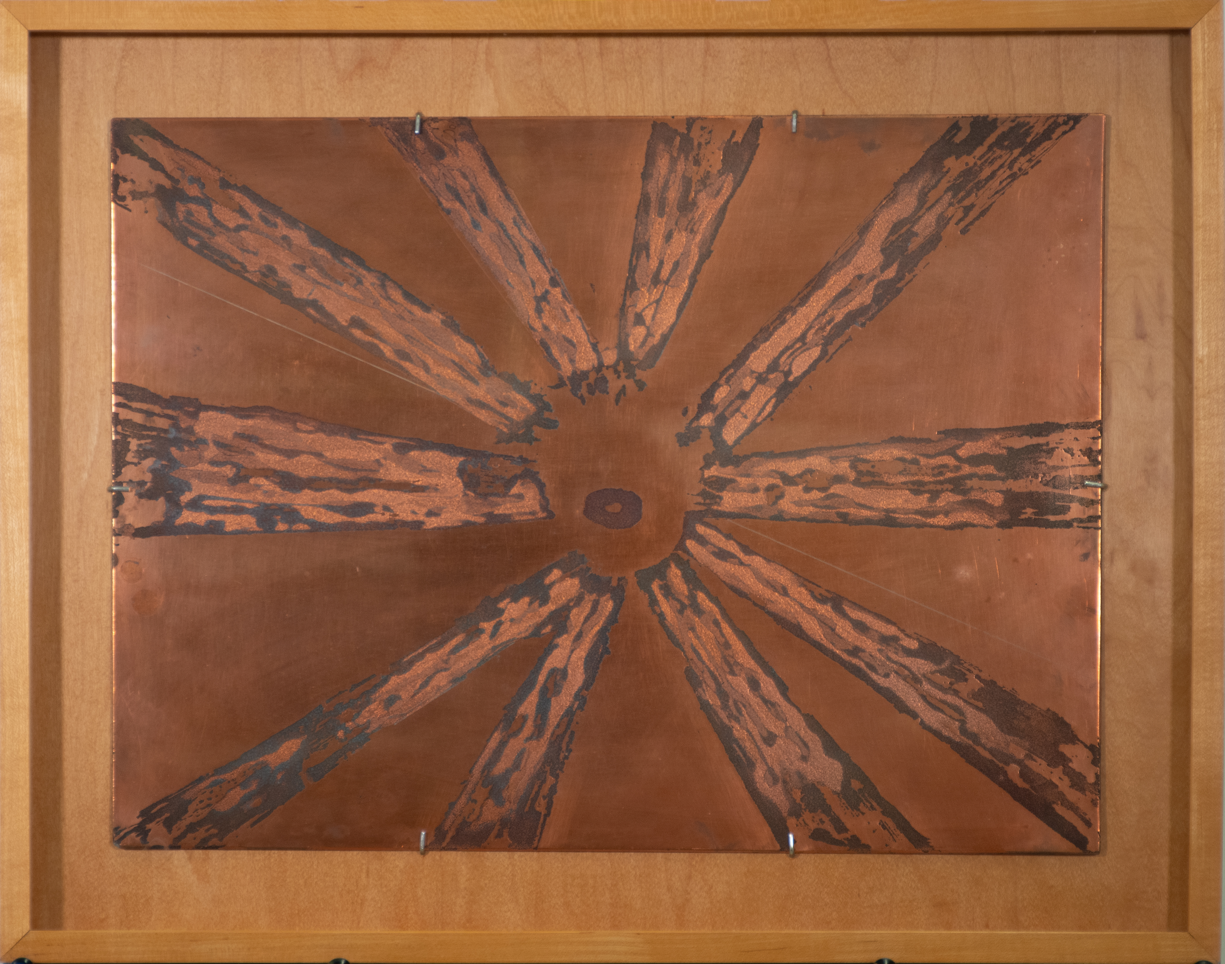 This is a zinc etching plate for one layer of Long’s Post Rome, lips with diagonal rays around them. In the full print, the center of the design is a large, oval-shaped eye. This is a frequently used motif in Long’s artwork, across many different mediums. Vertical and diagonal rays and bars draw attention towards the eye, which features a man’s face where the pupil would be. Long’s print was created during his 1990 Prix de Rome fellowship.