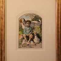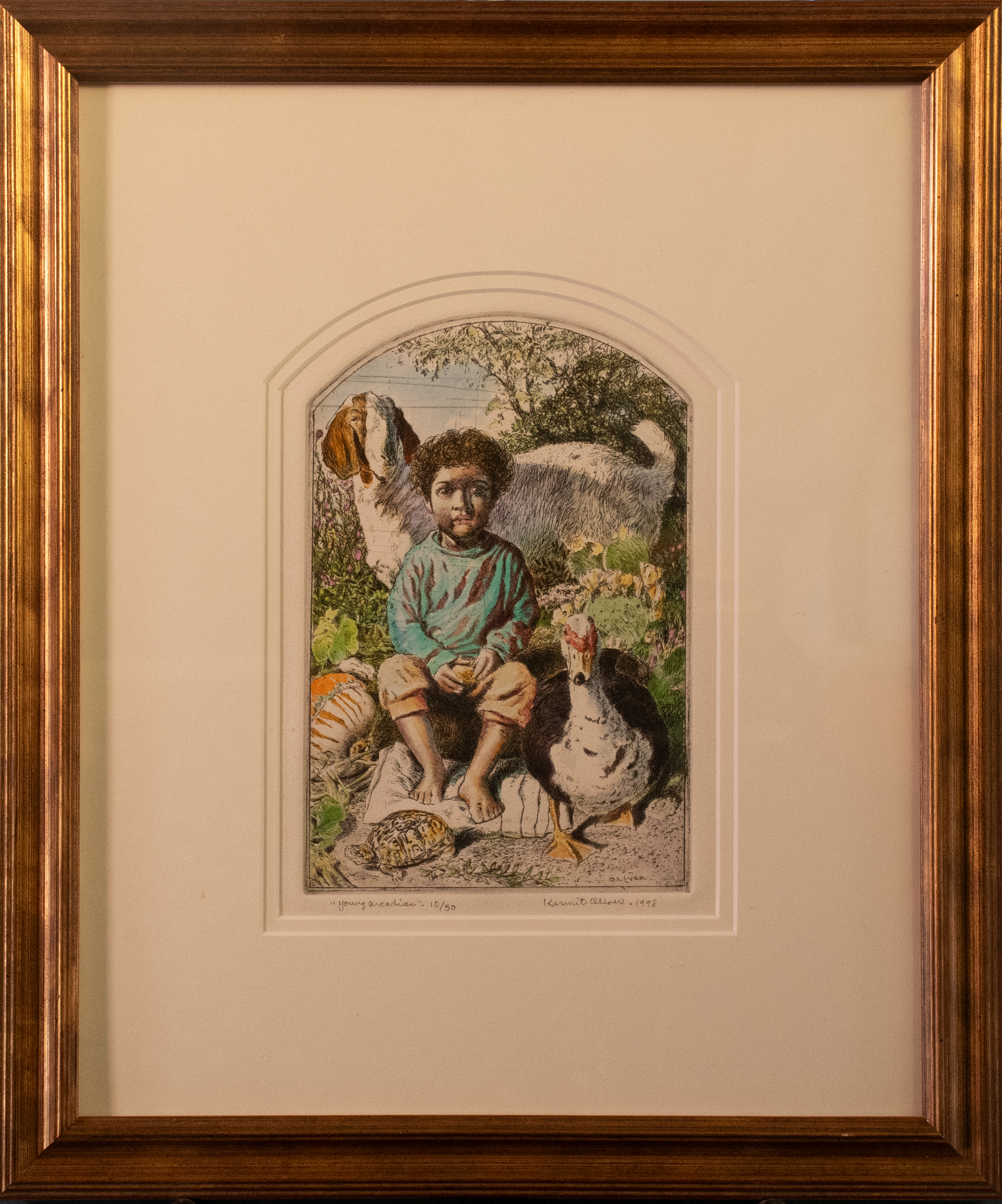 Oliver’s etching shows an idyllic scene, with a young boy surrounded by Texan flora and fauna. These include a muscovy duck, a goat, a turtle, a pumpkin, and more plants. Oliver grew up in Refugio in southeastern Texas, attended TSU, and moved to Waco after his graduation. Texas wildlife is a frequent subject of Oliver’s work, including his Hermes scarves.