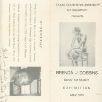 This is a brochure for Dobbins’ senior art exhibition. The culmination of the Texas Southern art curriculum is a senior exhibition where students showcase artwork created over the course of their undergraduate studies. The brochure features a photo of Dobbins, a brief biography, a catalog of the artwork featured in the exhibition, and a photo of one of her drawings. It is inscribed with a note from Dobbins.