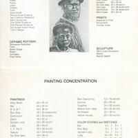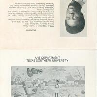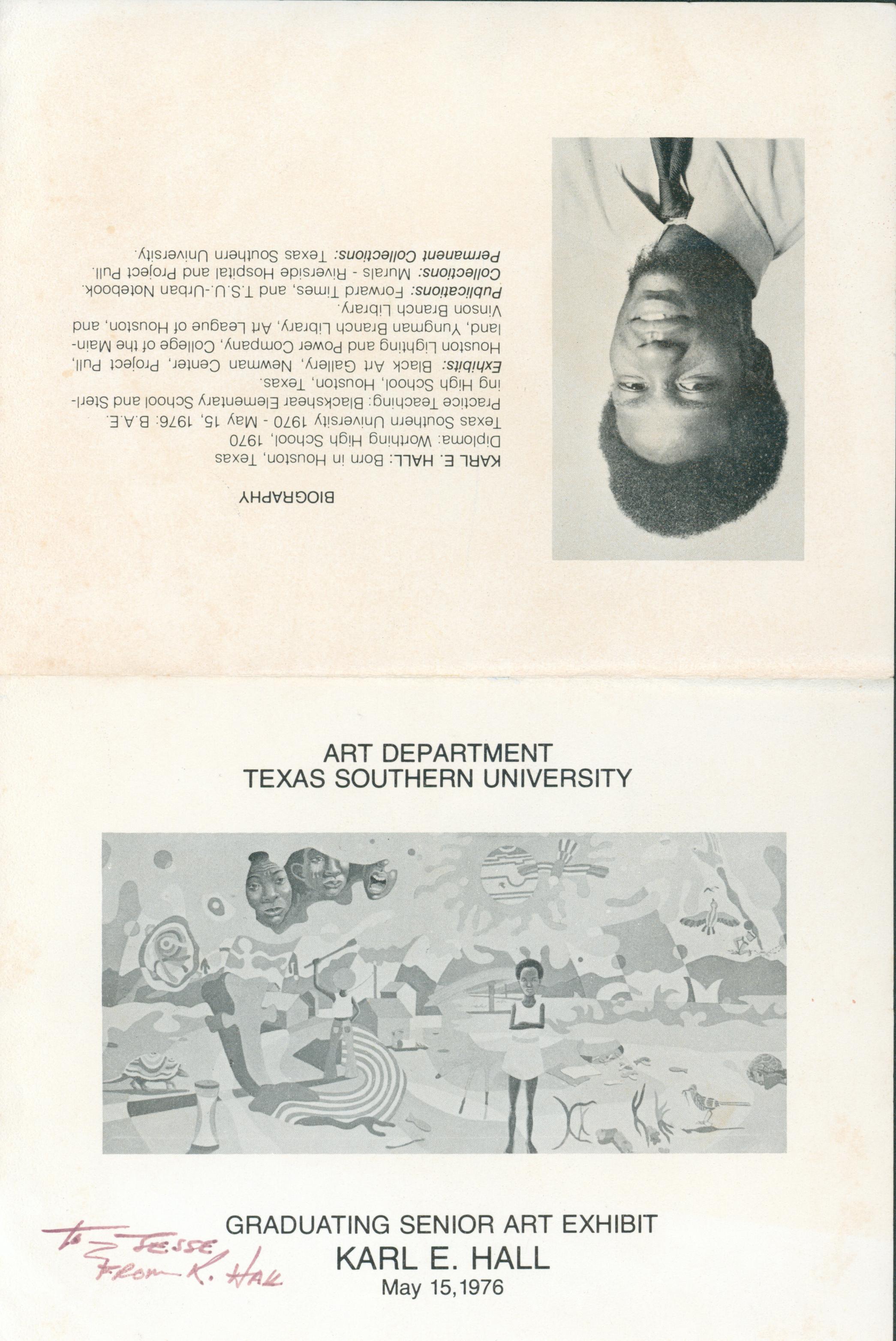 This is a brochure for Hall’s senior art exhibition. The culmination of the Texas Southern art curriculum is a senior exhibition where students showcase artwork created over the course of their undergraduate studies. The brochure features a photo of Hall, a brief biography, a catalog of the artwork featured in the exhibition, and a photo of one of his paintings. It is inscribed with a note from Hall.