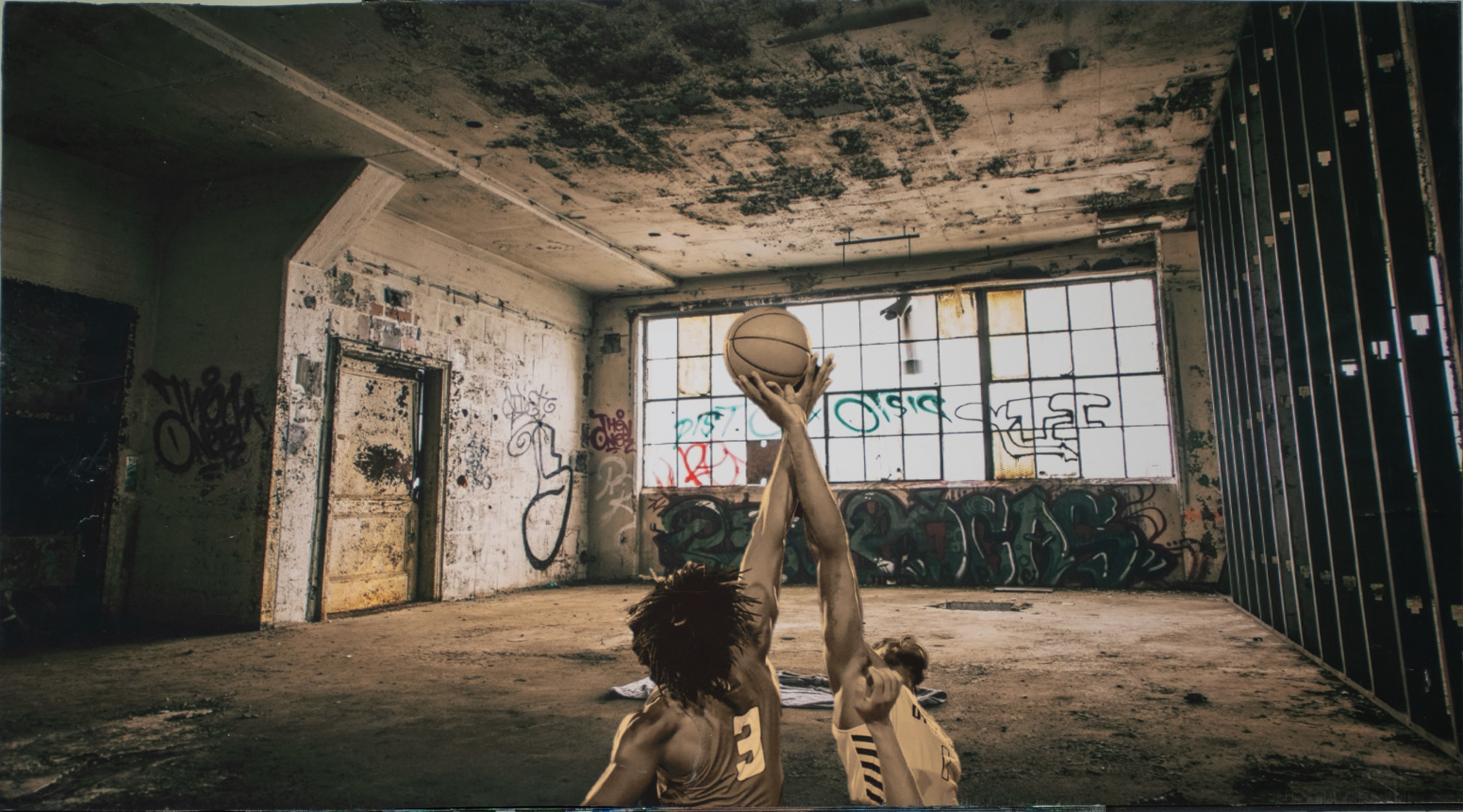 This work by Allen shows two basketball players reaching up for a jump ball amidst a run-down, graffiti-covered warehouse. The scene has minimal color, save for the graffiti, which enhances the abandoned atmosphere. Allen is an alumnus of Texas Southern and focuses on highlighting the Black experience in his work, often creating collages that include sports imagery.