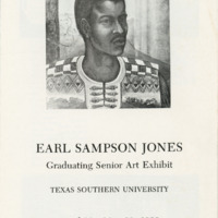This is a brochure for Jones’ senior art exhibition. The culmination of the Texas Southern art curriculum is a senior exhibition where students showcase artwork created over the course of their undergraduate studies. The brochure features a portrait of Jones, a brief biography, a catalog of the artwork featured in the exhibition, and several photos of his paintings, designs, weavings, and sculptures.