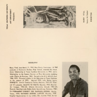 This is a brochure for Vital’s senior art exhibition. The culmination of the Texas Southern art curriculum is a senior exhibition where students showcase artwork created over the course of their undergraduate studies. The brochure features a portrait of Vital, a brief biography, a catalog of the artwork featured in the exhibition, and a photo of one of his paintings and sculptures. After graduating, Vital returned to TSU to teach art for many years.