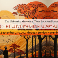 This is a digital flyer for the Fall 2023 Homecoming: The Eleventh Biennial TSU Art Alumni Exhibition at the University Museum at Texas Southern. The University Museum hosts an art alumni exhibition every other fall, alternating with an art faculty exhibition. Alumni showcase their artwork, which ranges from paintings, prints, and photographs to sculpture, jewelry, and wood carving.