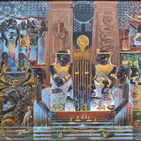 Biggers and Harvey Johnson, a former TSU art professor and student of Dr. Biggers, painted this mural in the lobby of the Jesse H. Jones School of Business. It speaks to the history of commerce and the wealth of Africa. NUBIA is full of visual symbols drawn from African art, including ceremonial combs, gold weights, and several meaningful animals, like the hippo, buzzard, sacred ibis, double crocodile, spider, tortoise, and more.