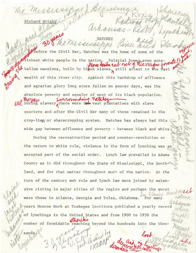 A draft of The Daemonic Genius of Richard Wright: A Portrait of the Man: A Critical Look at his Work. Draft with written notes on Natchez years.