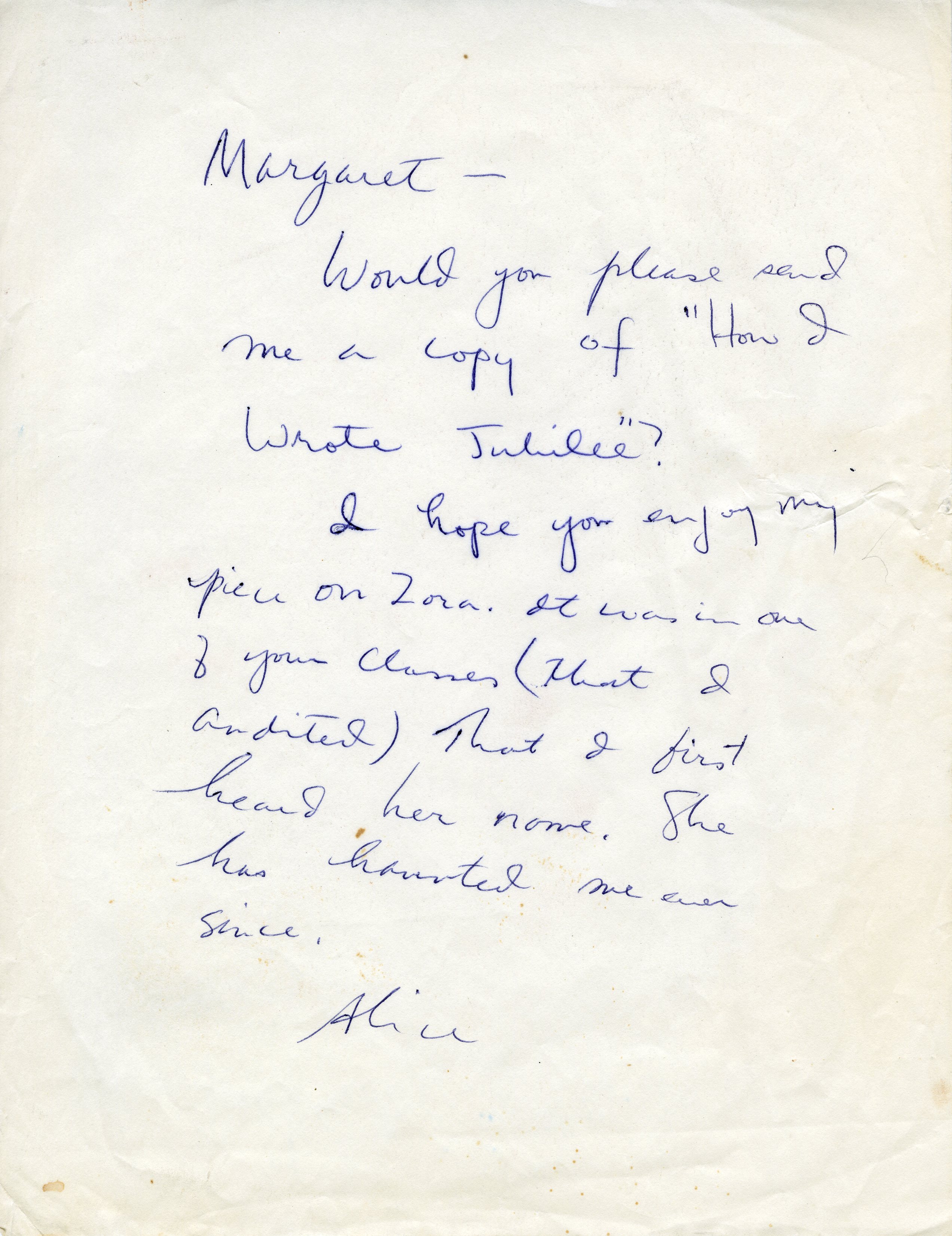 Renowned writer and activist Alice Walker was a dear friend of Margaret Walker. In this letter, Alice Walker asks Margaret Walker for a copy of “How I Wrote Jubilee.” Alice Walker also mentions a new piece she has about Zora Neal Hurston and that she first heard of her in one of Margaret Walker’s classes she was auditing.