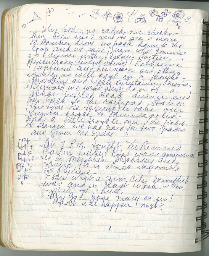 In this entry, Margaret Walker is writing from Minneapolis, Minnesota. She is reacting to the assassanation that day of Martin Luther King Jr., writing, “May God have mercy on us! What will happen next?” This page also reflects her doodling, which can be found across the entire collection of her journals.