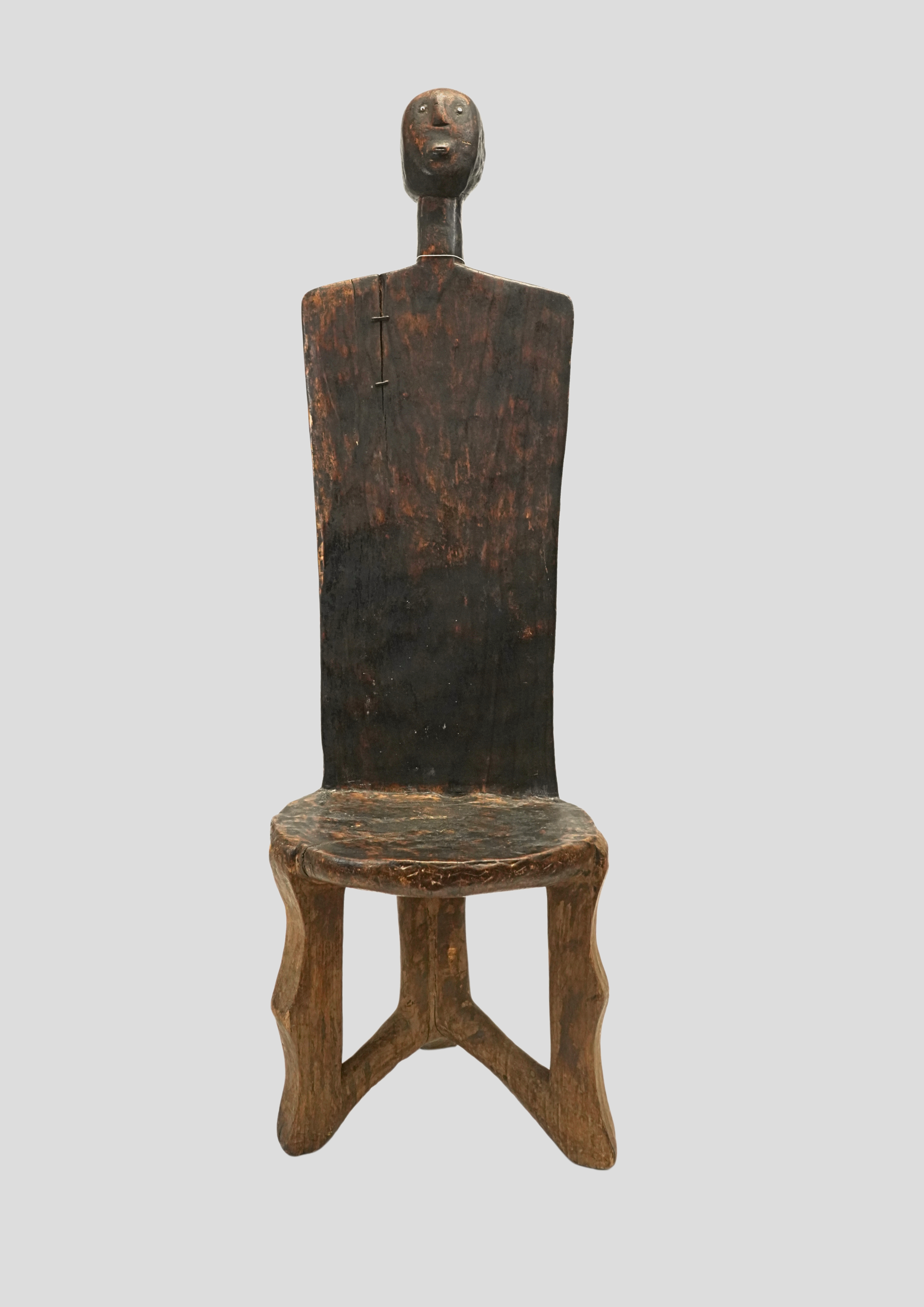 This dark wood carved African chair features intricate facial and head carvings at the top, embodying rich cultural artistry and spiritual significance. Traditionally used in ceremonial contexts, it reflects the craftsmanship and storytelling inherent in African art. Donated by Tallahassee locals Calynne and Louis Hill.