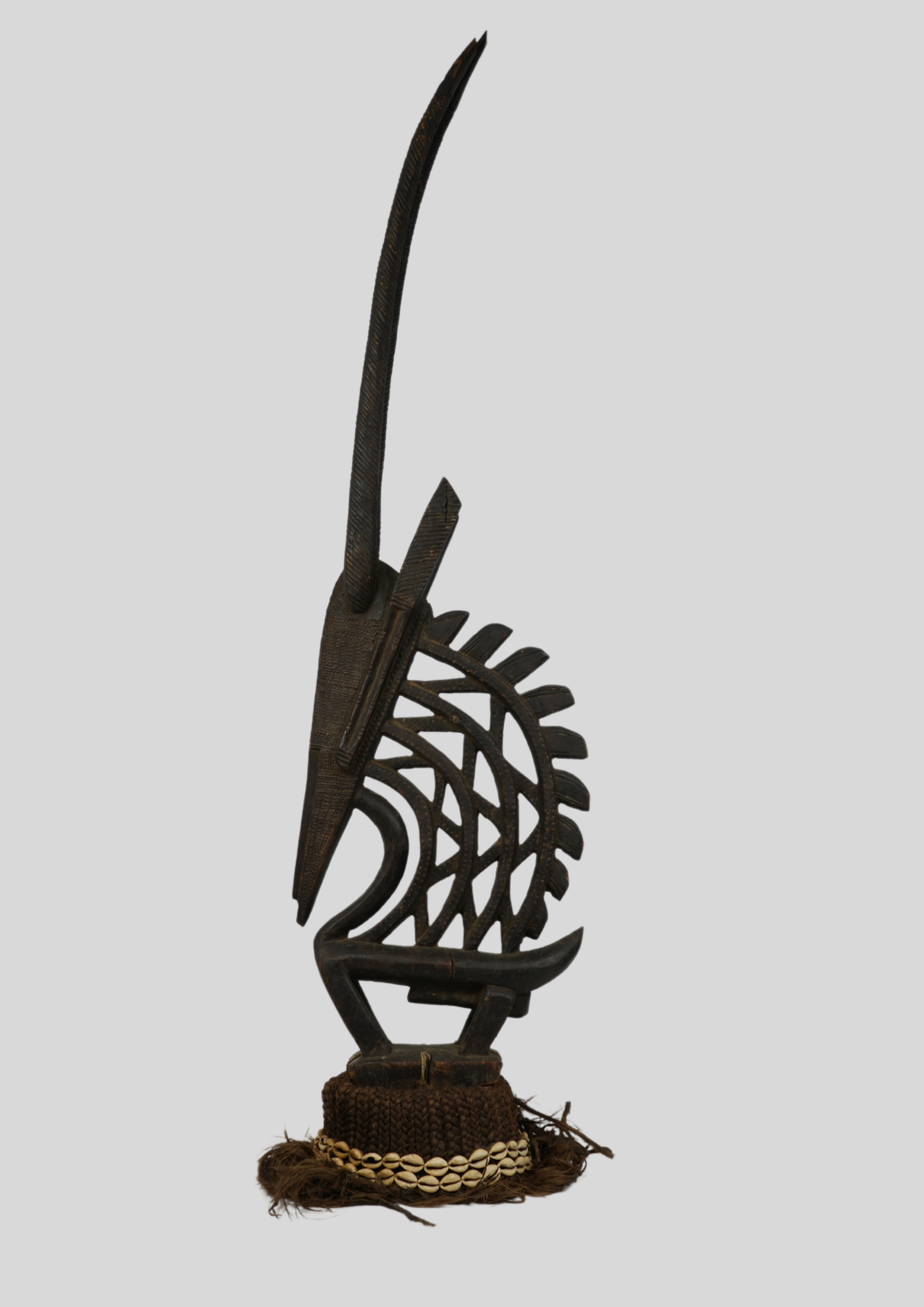 The agricultural society of the Bamana people in West Africa (mainly Mali), also known as Bambara, honors Ci Wara, the mythical being they believe granted them the gift of farming, through wooden carved headdresses. This sculpture combines the features of humans, antelopes, and other native animals for performances celebrating successful farmers.