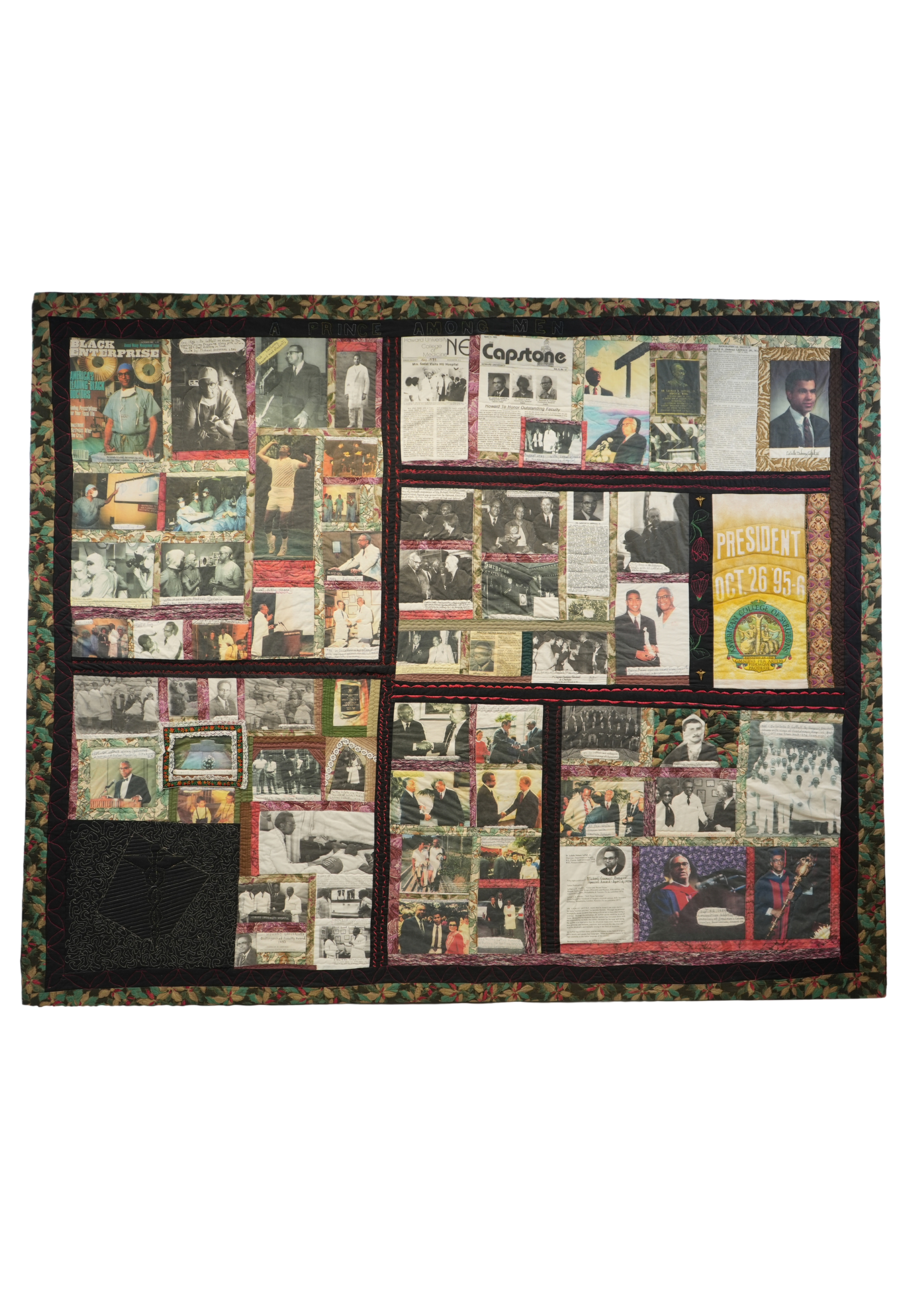 This quilted textile by Debra Hanes is an homage to Dr. LaSalle D. Leffall, Jr., showing the highlights of his career and life. Prevalent in African American culture, this piece is a type of “life quilt”, as this colorful tapestry gives the viewer a glimpse into the doctor’s life with sewn-on prints of letters, magazine covers, and photographs.