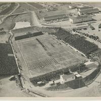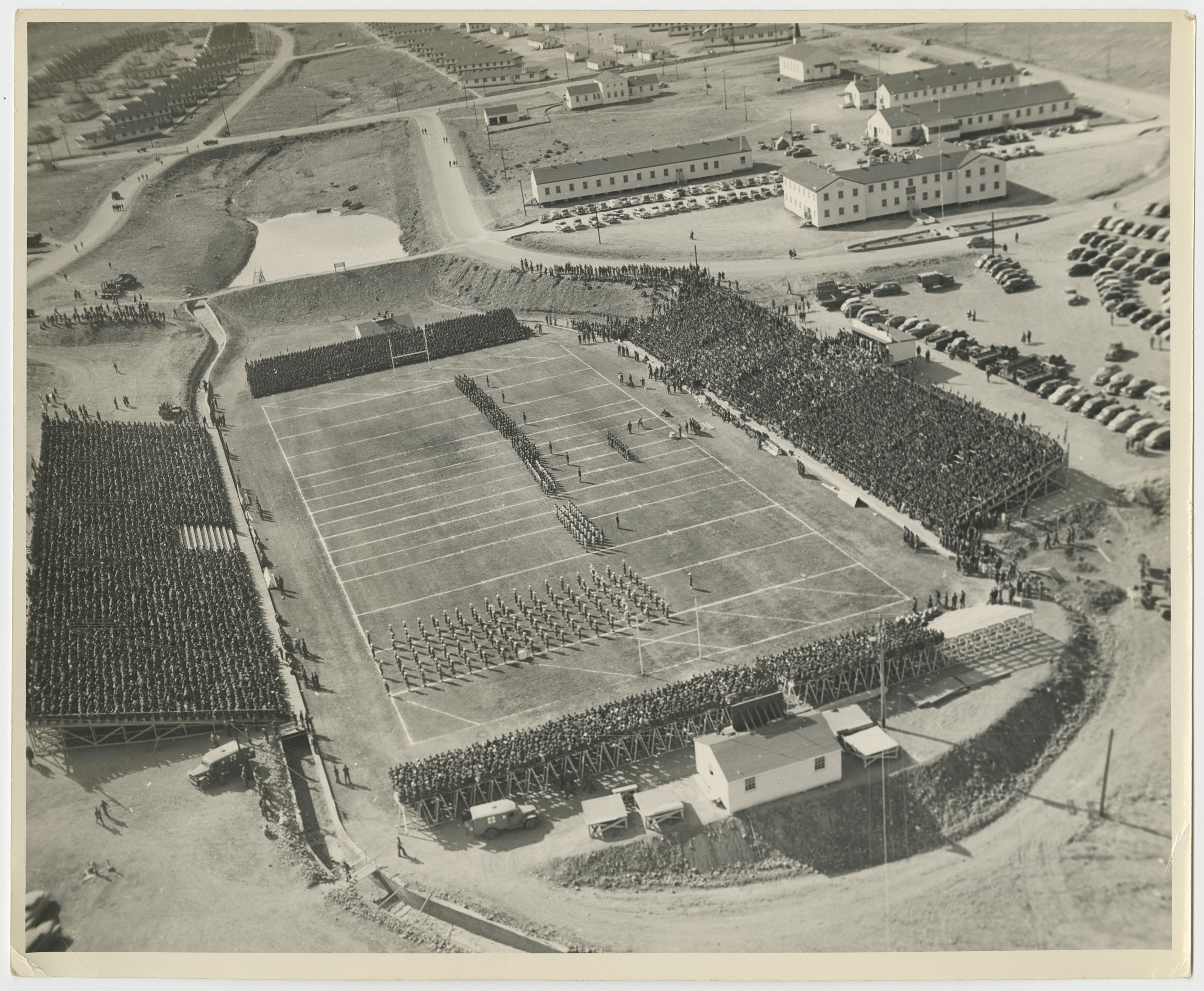 This undated, black-and-white photograph shows an aerial view of Ken Riley Field at Bragg Memorial Stadium in Tallahassee, Florida, during some type of performance, most likely of the Marching 100, Florida A&M University’s marching band. The stadium appears unfinished, with construction and large ditches surrounding the outer seats.