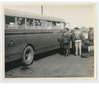 In this photograph, beaming Black soldiers smile and wave out the windows of a bus with the Southern Pacific Lines insignia on the side. Others stand around bags of luggage waiting to enter the transport. While Southern Pacific Lines was known as a locomotive company, this vehicle appeared to be a bus rather than a train car.