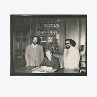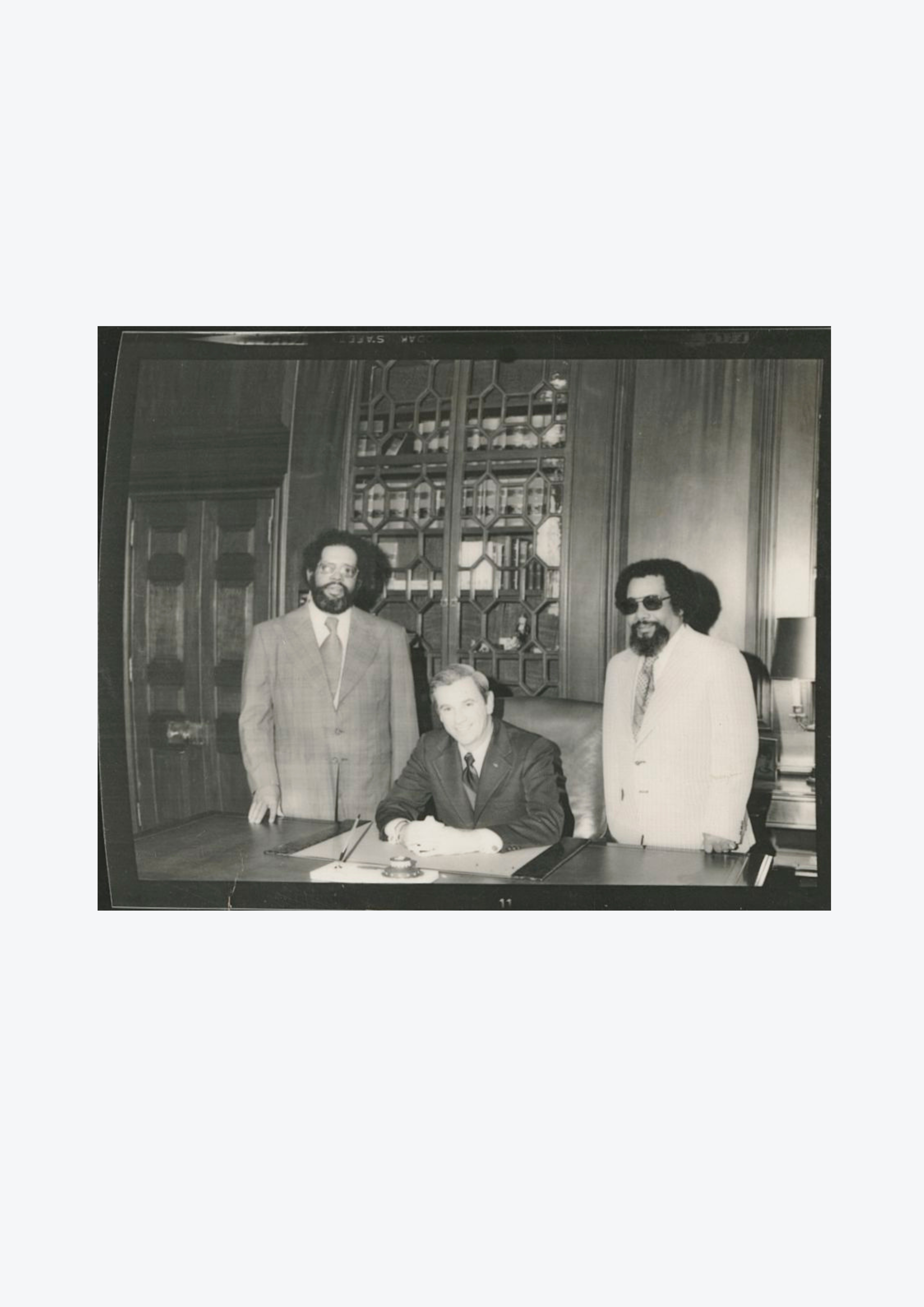 This undated, black-and-white photograph features Julian “Cannonball” and Nathaniel “Nat” Adderley, jazz and blues musicians, and Reubin O’Donovan Askew, the governor of Florida in the 1970s. The Adderley brothers were Florida A&M students and Tallahassee jazz legends, playing saxophone (Cannonball) and cornet (Nat) with Ray Charles and others.