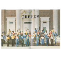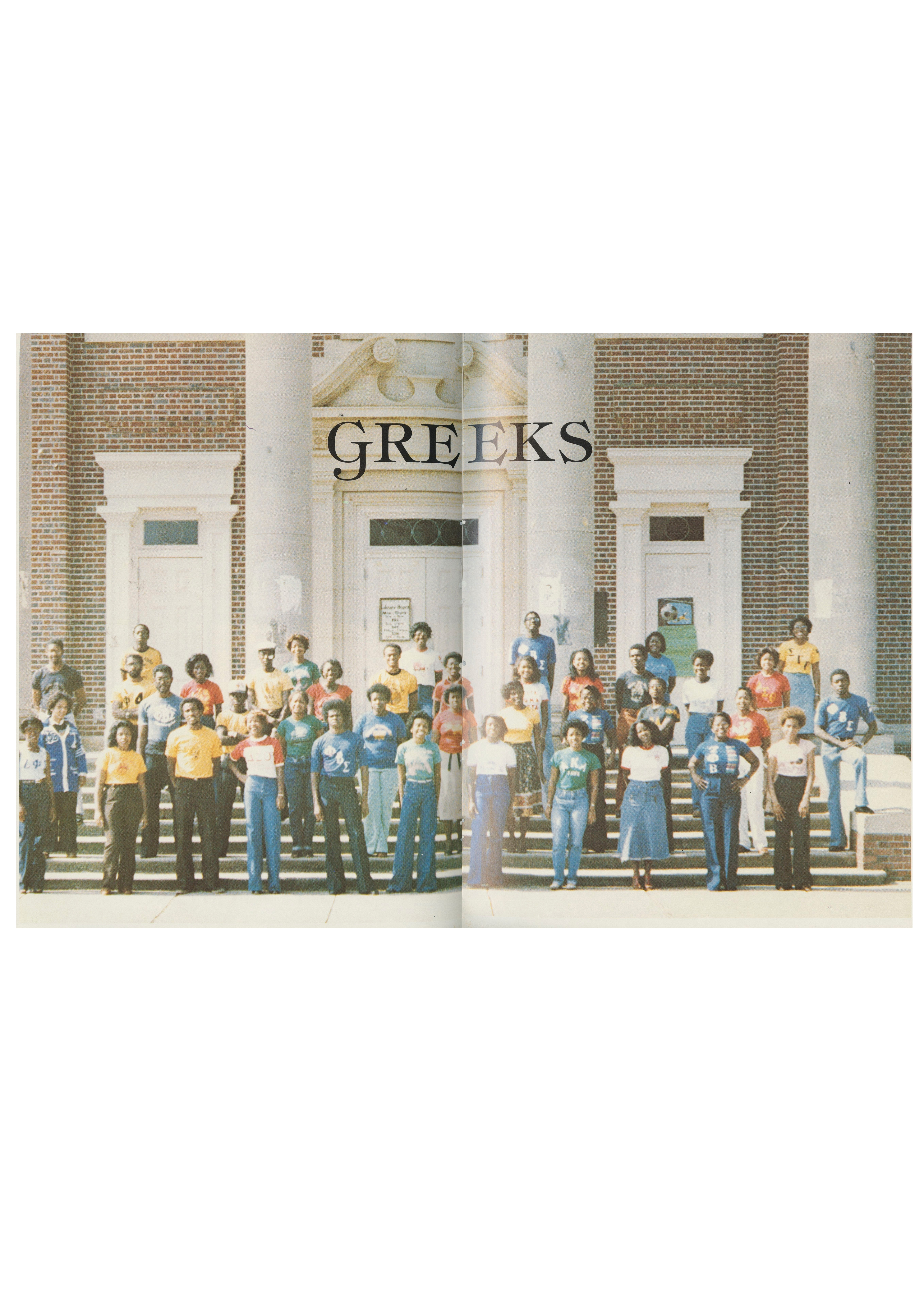 This two-page spread in the 1979 Florida A&M Rattler Yearbook features members from the chapters of FAMU’s Divine Nine fraternerities and sororities. In their organization’s t-shirts and jeans, these Greeks stand on the steps of Coleman Library.