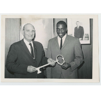 This rare, original black-and-white photograph features award-winning track star and Florida A&M alumni Robert “Bullet Bob” Hayes and an unidentified political figure. In what appears to be a government office, due to the portraits of Presidents John F. Kennedy and Lyndon B. Johnson, Hayes is receiving a ceremonial key.