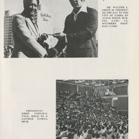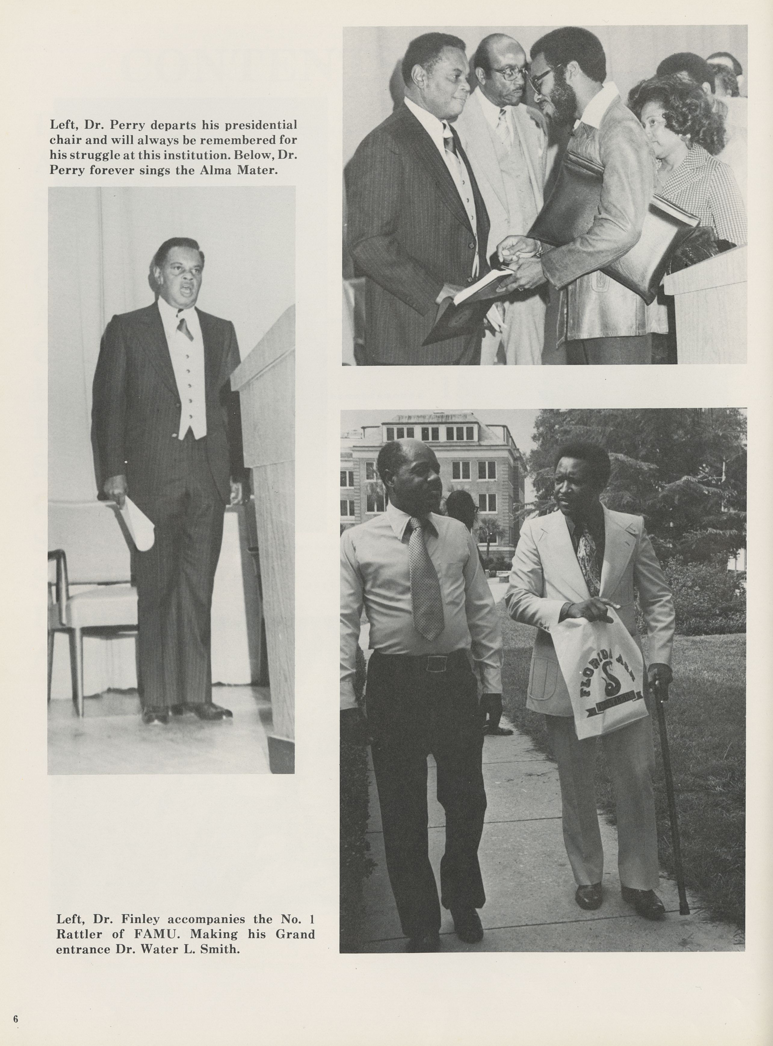 These images were featured in the 1978 Rattler Yearbook. It shows the transition of Florida A&M president Dr. Benjamin L. Perry to new president Dr. Walter L. Smith. Perry is seen singing the FAMU Alma Mater while Smith strolls around campus with faculty member Dr. Finley.