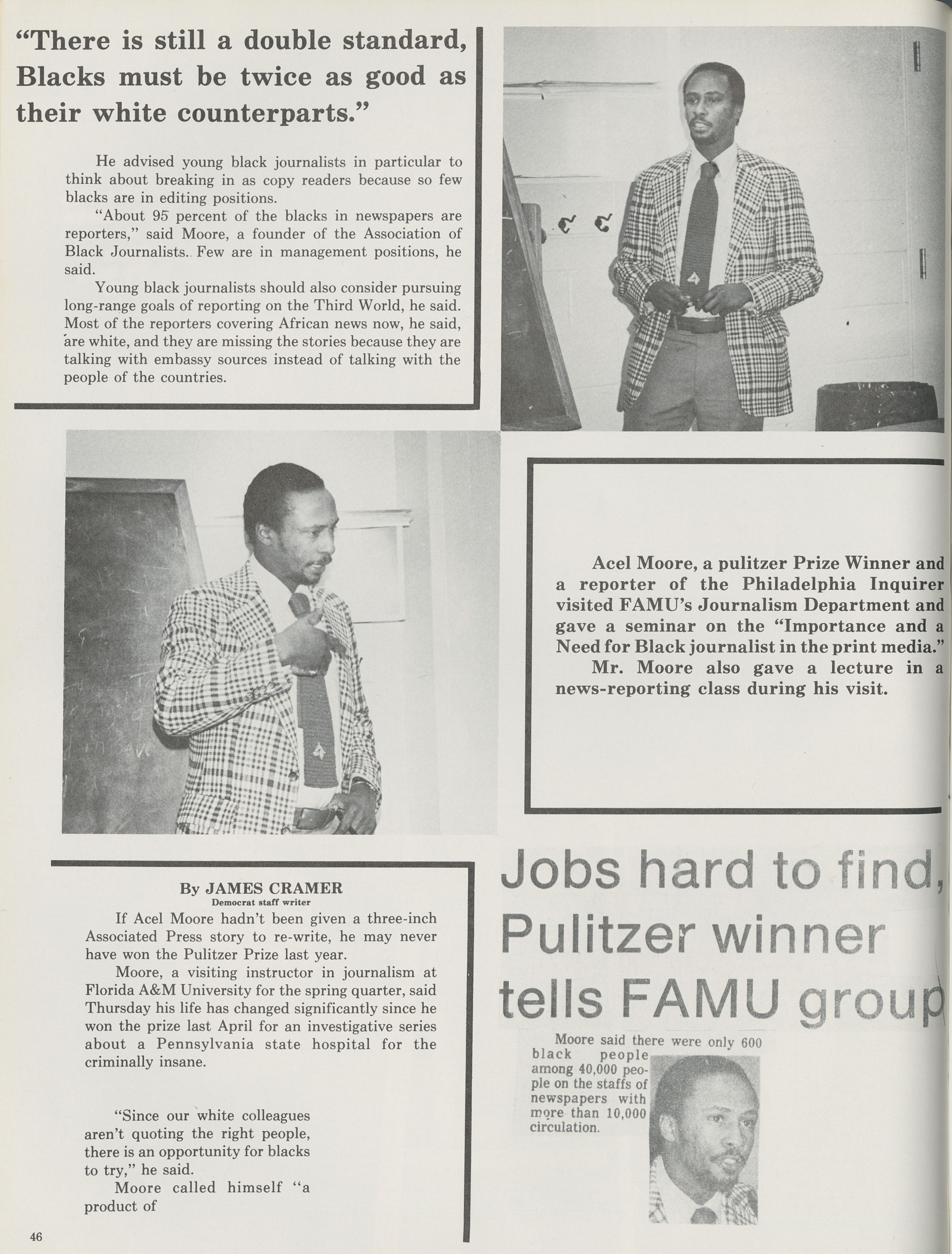 In this page from the 1978 Rattler Yearbook, Acel Moore, a Black Pulitzer Prize Winner and reporter for the Philadelphia Inquirer, visited Florida A&M’s Journalism department and news-reporting class to give a seminar and lecture on the increased need for Black journalists in print media.