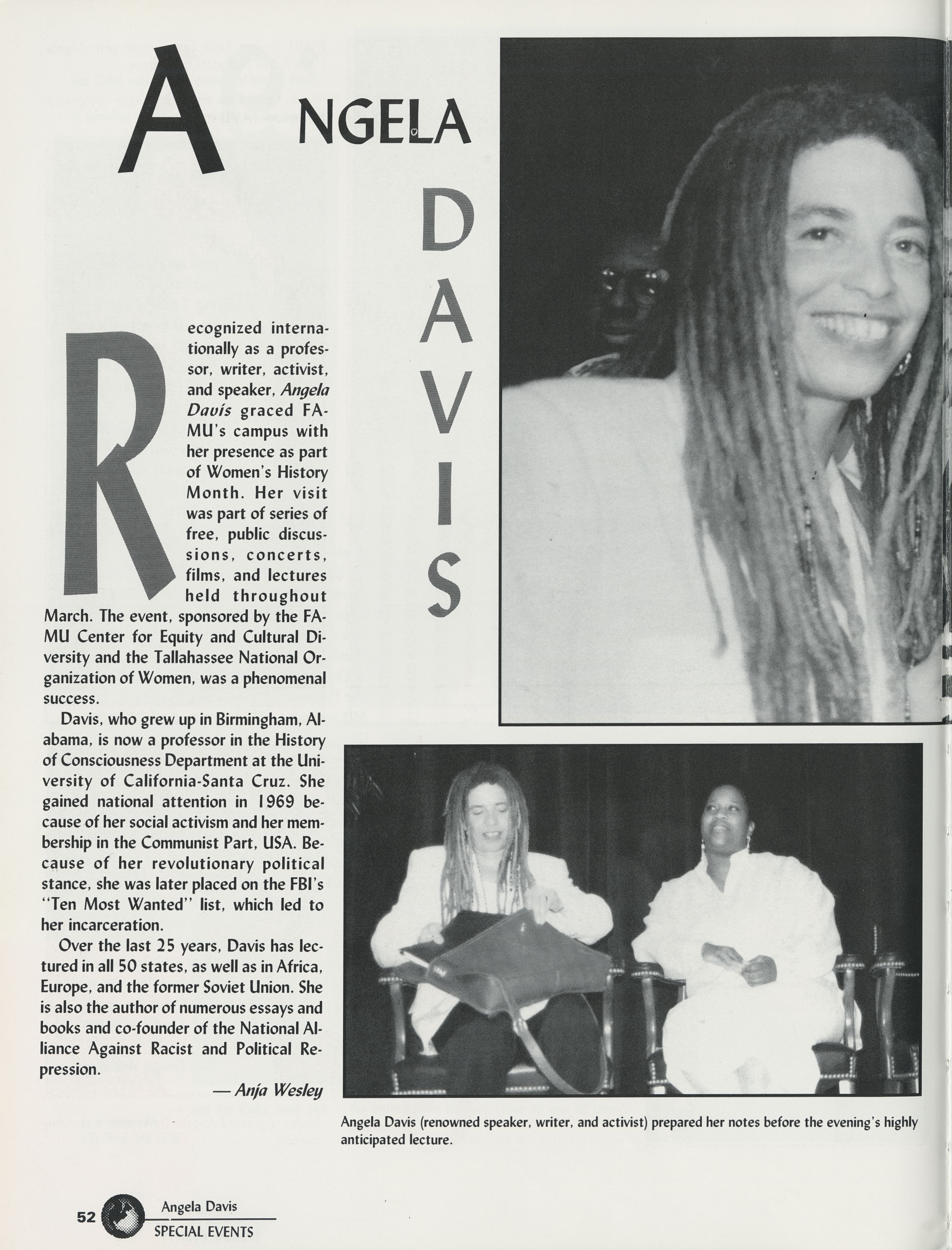 As a part of a Woman’s History Month event in the early 1990s, Angela Davis lectured at Florida A&M’s campus. In rare photographs of Davis in dreadlocks, the international civil rights activist and writer spoke for the event sponsored by the Tallahassee National Organization of Women and the FAMU Center for Equity and Cultural Diversity.