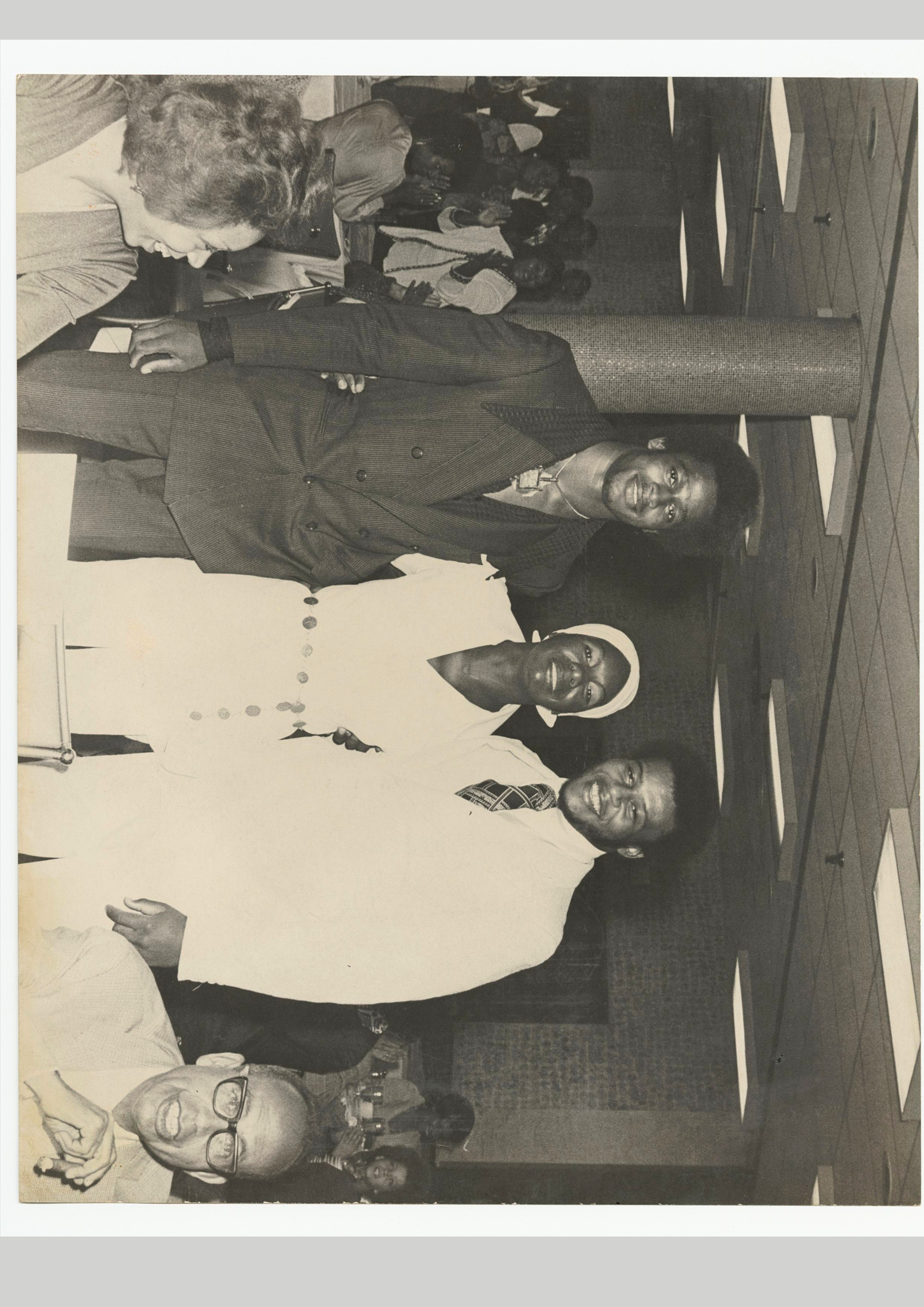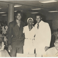 In this rare photograph, Nina Simone stands with A. Poole (as inscribed on the back of the photo) and another unidentified Black male. The trio is posing in the middle of what appears to be a Florida A&M event banquet, as people eat around them while others dance in the background. It’s unclear when this was taken.