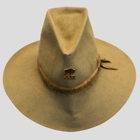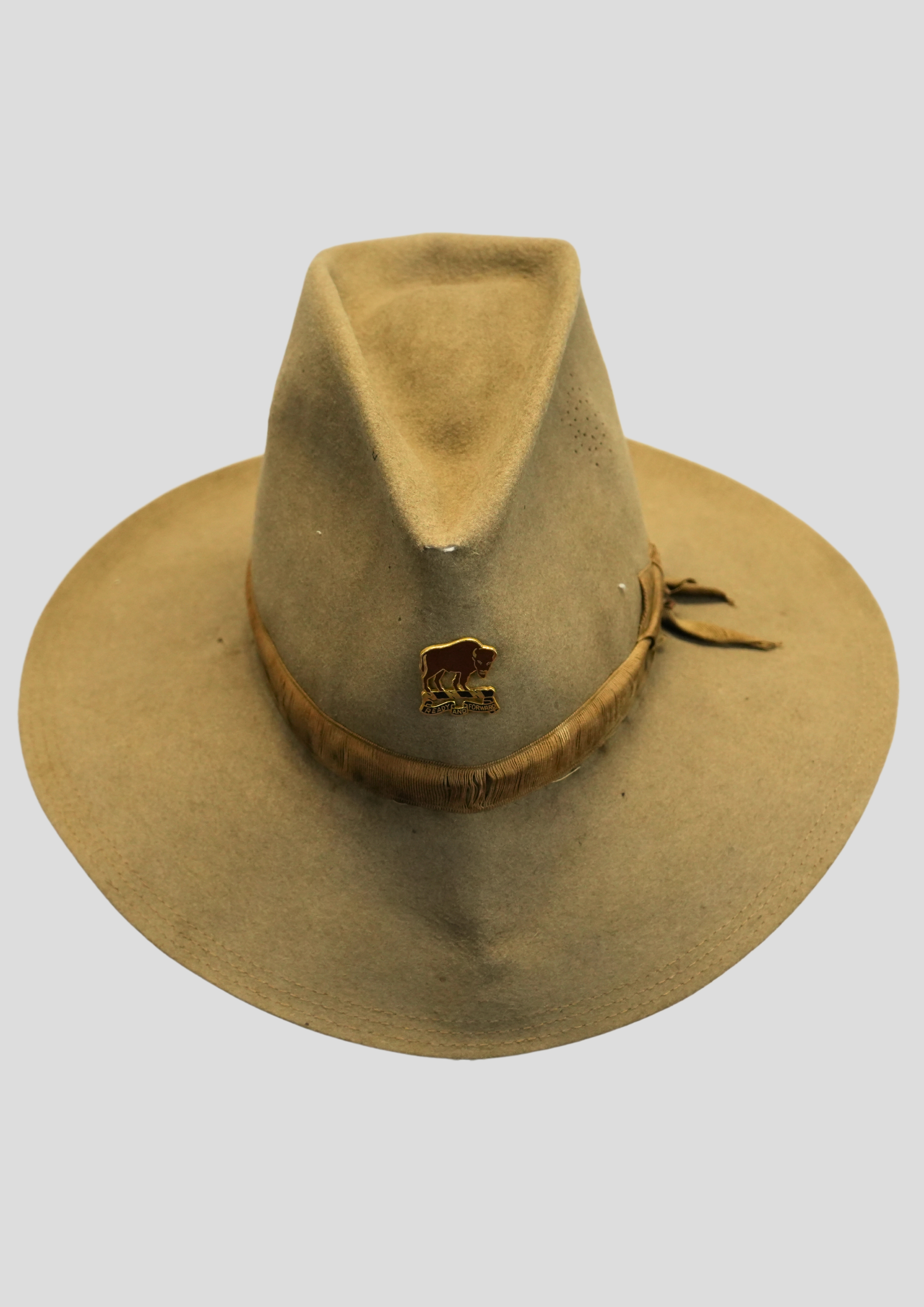 The Buffalo Soldier Stratton hat is a distinctive military headgear associated with the African American cavalry regiments known as Buffalo Soldiers, and belonged to Benjamin French. Crafted from durable materials, it features a wide brim and a high crown, symbolizing pride and resilience.