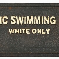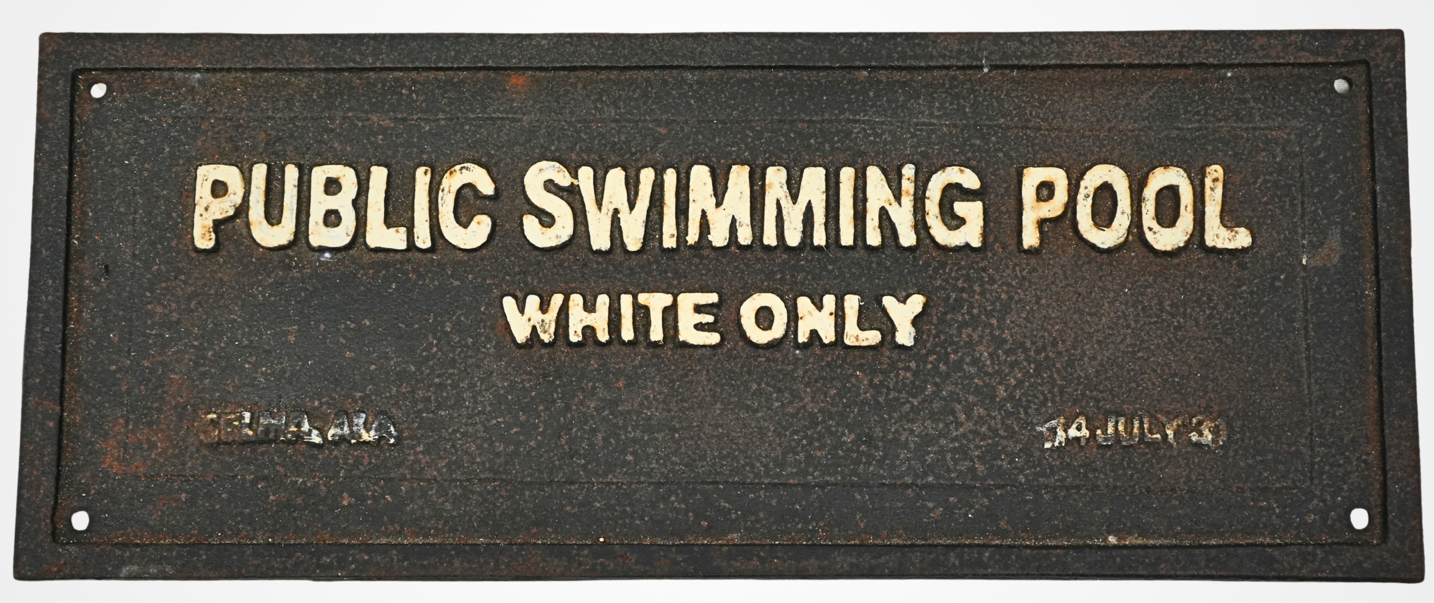 The iron "Whites Only" swimming pool sign from Selma, Alabama, dating back to 1931, starkly illustrates the era's racial segregation and discrimination. This historical artifact symbolizes the oppressive Jim Crow laws that enforced racial barriers in public spaces.