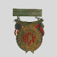 This 1913 Confederate Reunion medal, a souvenir from the United Confederate Veterans (UCV) gathering in Chattanooga, commemorates veterans of the Civil War. The medal features Confederate symbols and celebrates the reunion of former soldiers.