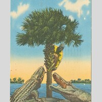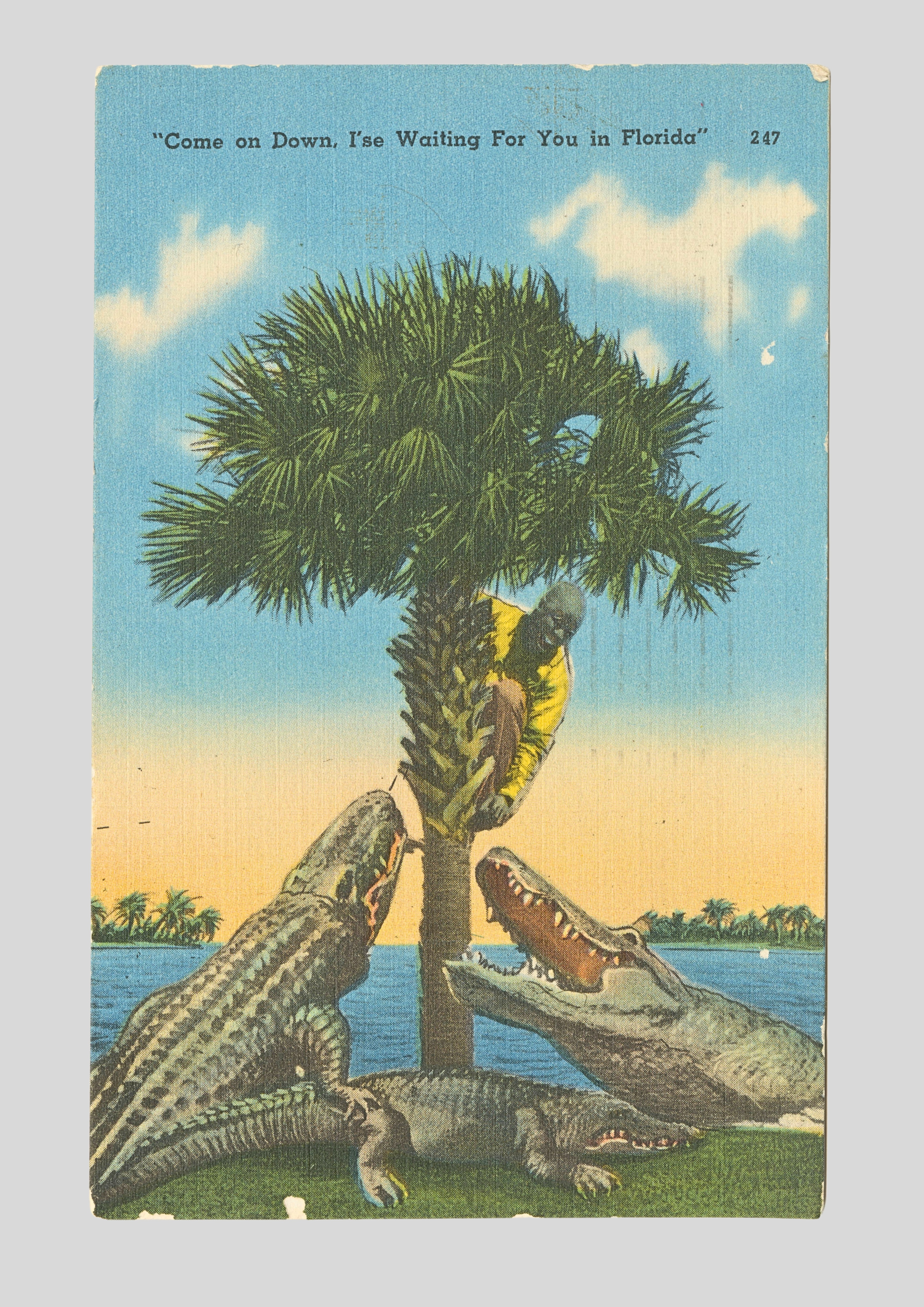 This 1954 Florida postcard shows a striking image of an alligator circling a palm tree, with a Black man seemingly holding on for dear life, his expression filled with fear. The alligators in this serve as a symbolic representation of the dangers and challenges faced by Black men in society, reflecting the racial tensions and struggles of the time.