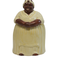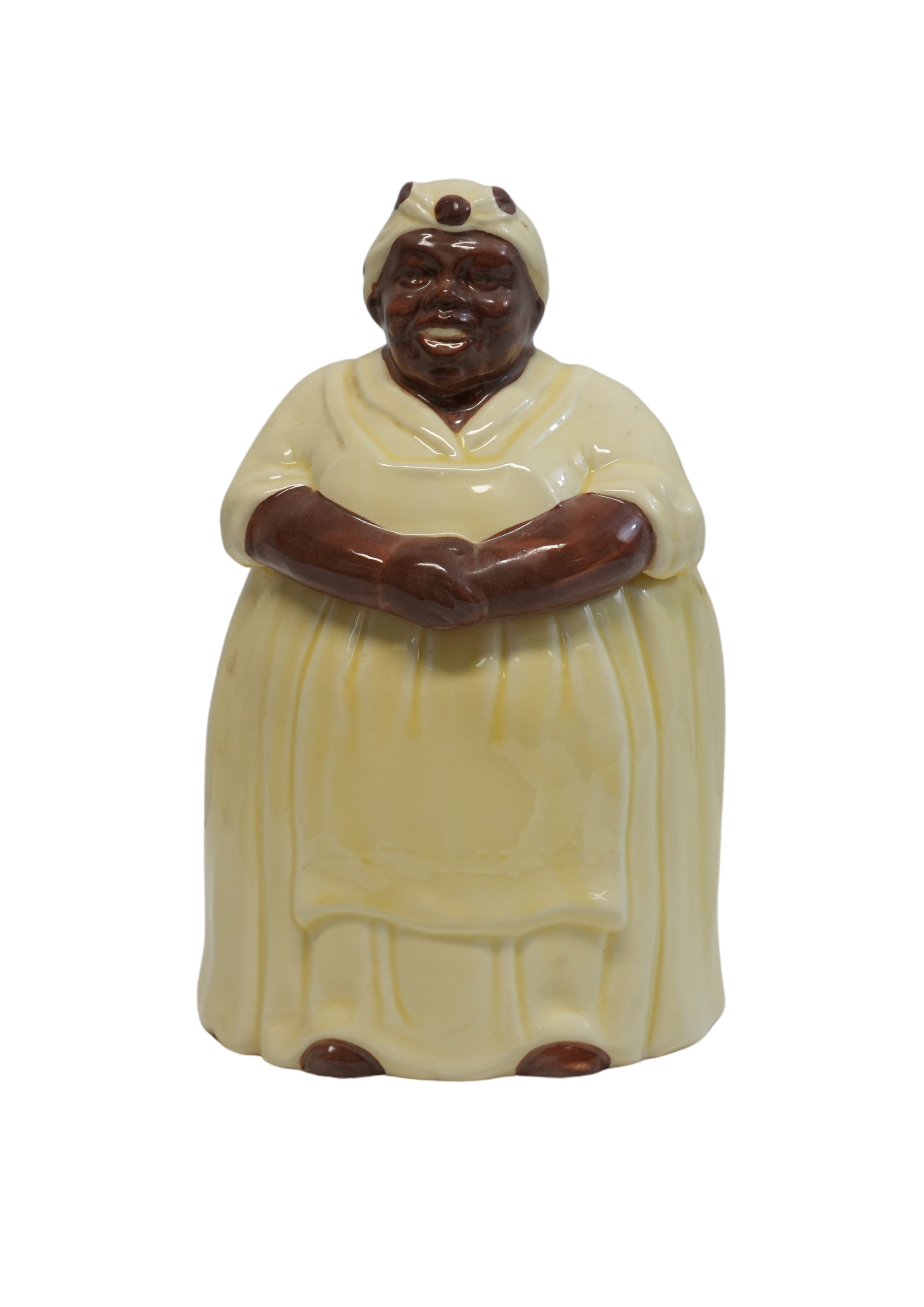 This ceramic cookie jar was part of a collection released by Ohio-based company Mosaic Tile. Albeit rare, the original and most common reproduction is the version depicted here, standing around 13 inches tall with a yellow dress and yellow headwrap. However, the dress can show up in a variety of rarer colors such as blue, peach, and green.