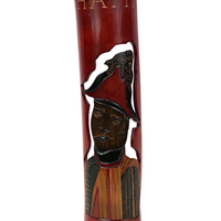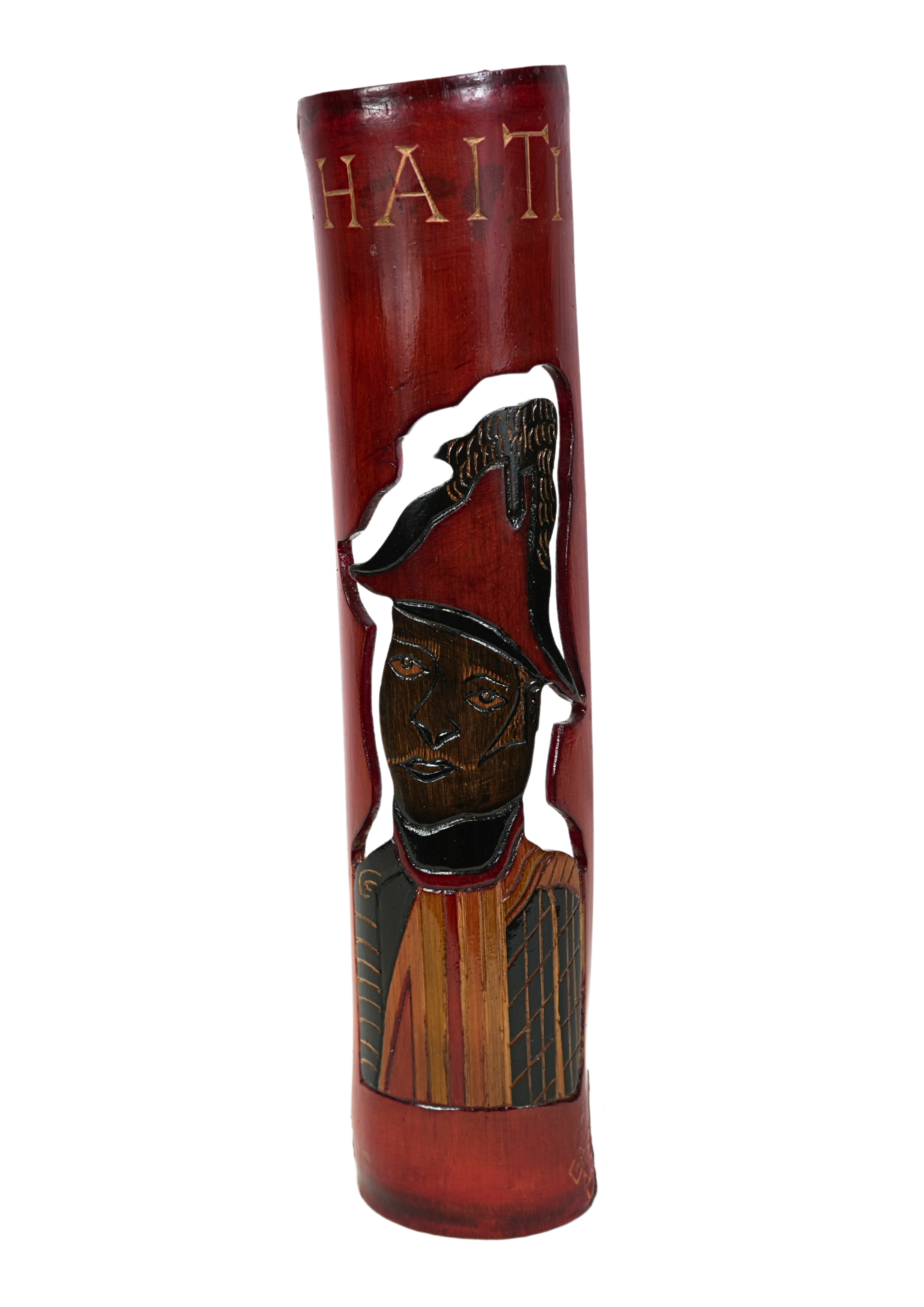This red plank is made of wood and painted over to give a shiny luster. The artwork features a soldier, possibly Toussaint Louverture, with the word “Haiti” carved above it. On the back of the piece, an inscription says “Ayiti Cheri ZP”, Haitian Creole for “Haiti my dear/my baby” (it’s unclear what the ZP could stand for).