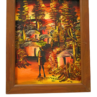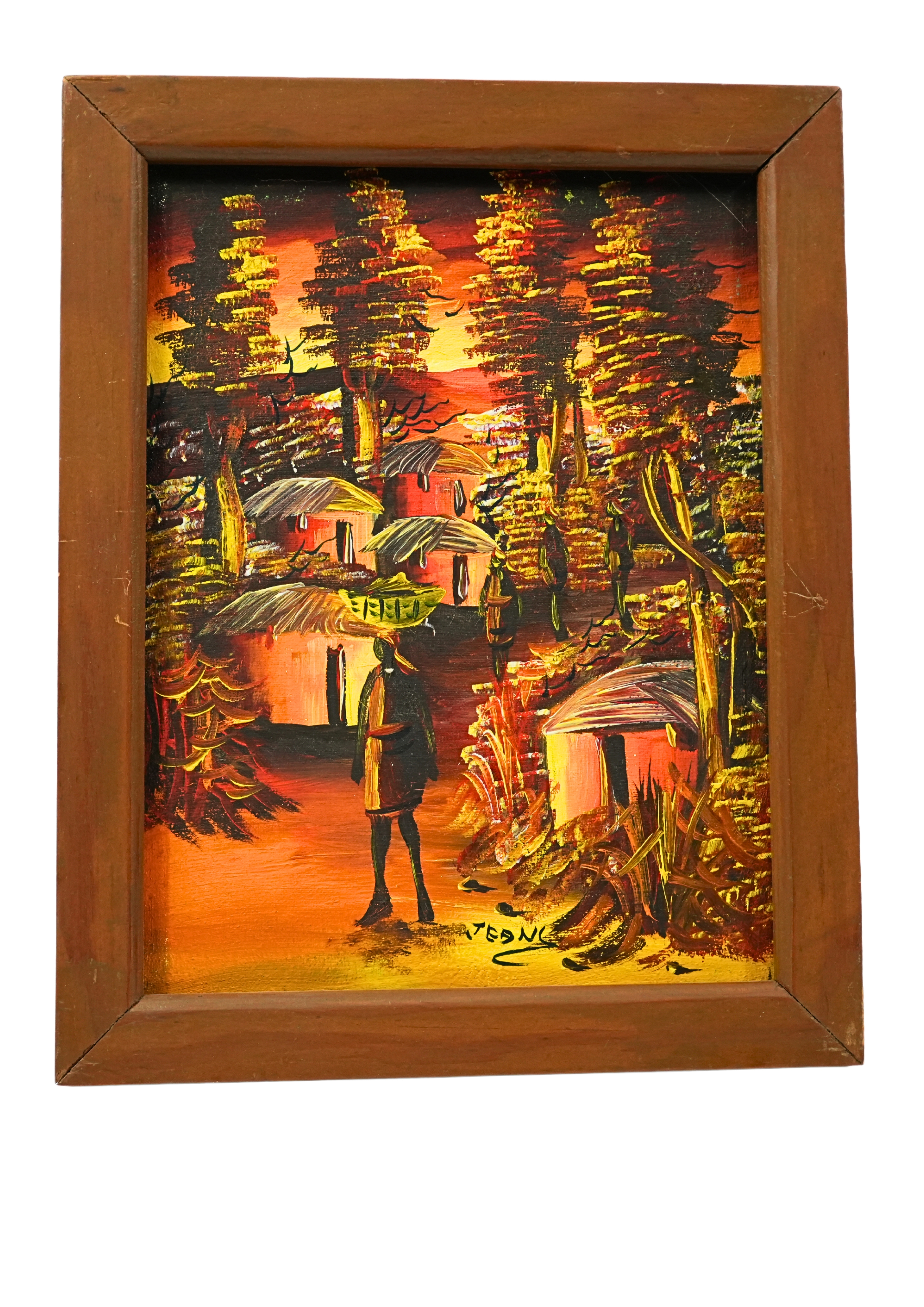This untitled painting from the FAMU Black Archives/Caribbean Art Collection has limited identification for proper attribution. While it appears to be the same artist from the collection, this piece depicts a village scene with bright orange lighting basking from a setting, or rising, sun – a contrast from the blue paintings seen earlier.