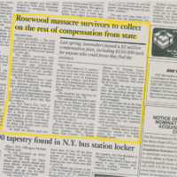 Newspaper clippings from 1995 document Minnie Lee Langley’s efforts to secure compensation for the 1923 Rosewood Massacre. Through her written statements, Langley shares vivid accounts of the tragedy, reflecting on the losses endured and her pursuit of justice for her community.