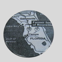 This button was one of three designs in a VisitGainesville bag from the Rosewood Museum. It depicts a map of Florida (except for the uppermost part of the panhandle and the lowermost tip of the southern region), pointing out where the town of Rosewood used to stand before it was subjected to racial violence.