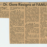 Newspaper clippings and an article from *The FAMUAN* reflect on President Gore’s resignation in 1968, marking the end of a distinguished era of leadership. The pieces highlight his transformative contributions to FAMC and FAMU, his dedication to education, and the enduring legacy he left on the university and its community.