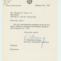 On January 26, 1965, the president’s monthly meeting with student leaders brought together representatives from campus organizations. The president invited all organization presidents to a dinner to discuss initiatives and improvements students wished to see at Florida A&M University, fostering collaboration and shared goals for the campus.